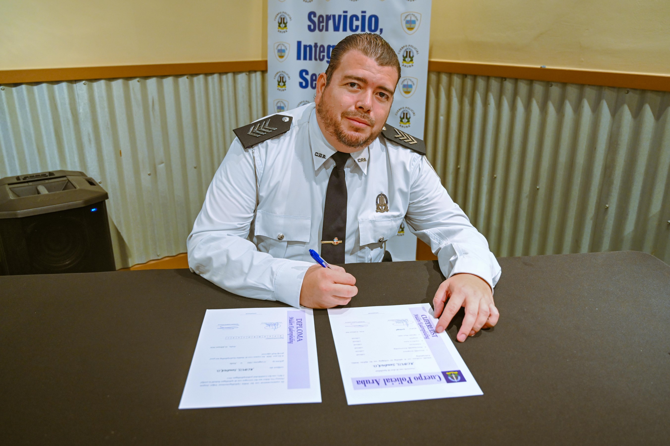 “Kisas bo ta haya mas strepi of subi di rango, pero ta un Polis integro, duna respet y tin e norma cu balornan halto ta haci bo un bon Polis. Masha pabien na tur studiante cu a huramenta tambe na e agentenan policial cu a ricibi nan diploma, boso a traha duro pa esaki!” tabata palabranan di altocomisario Arnhem masha orguyoso di mira desaroyo positivo den nos Cuerpo.