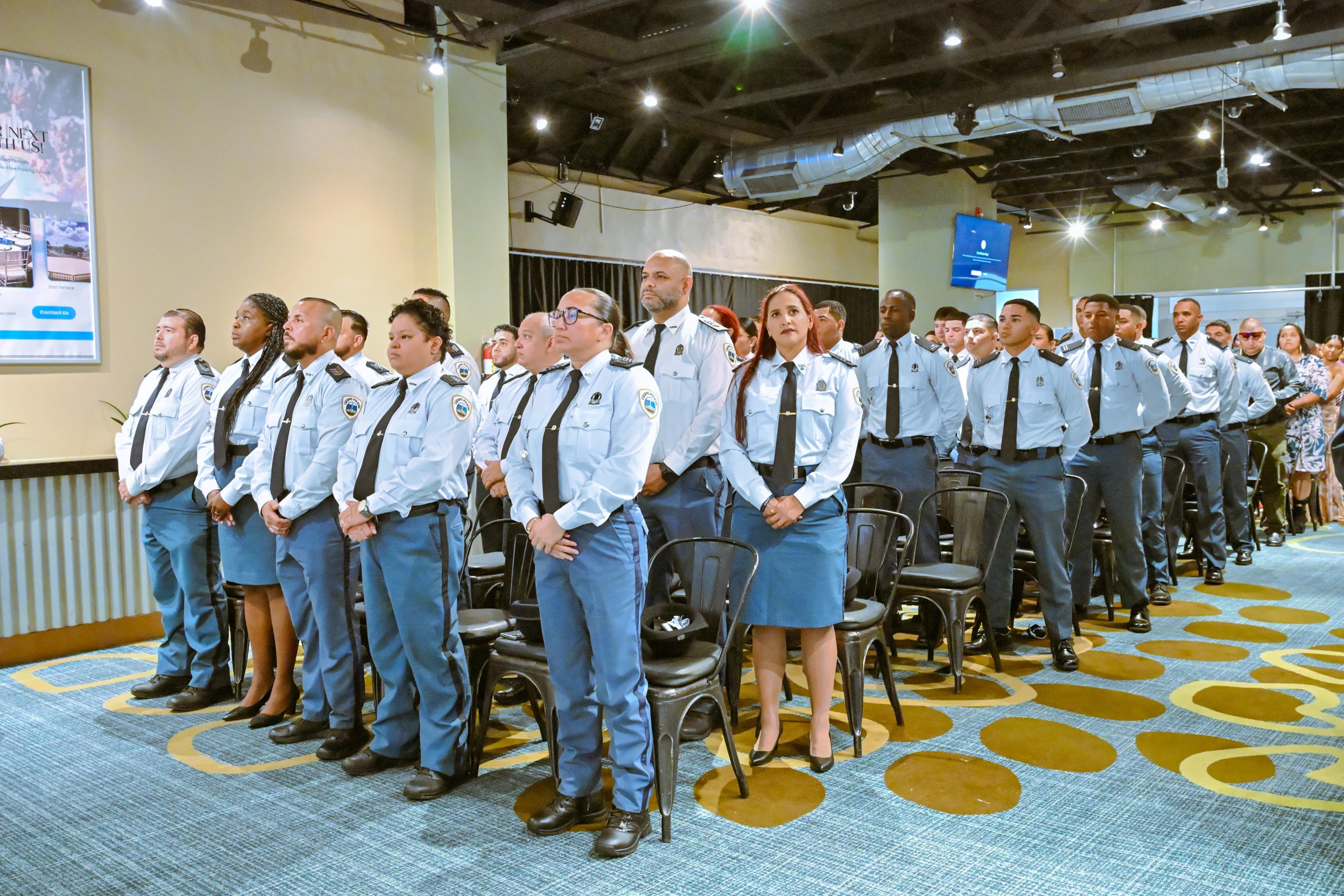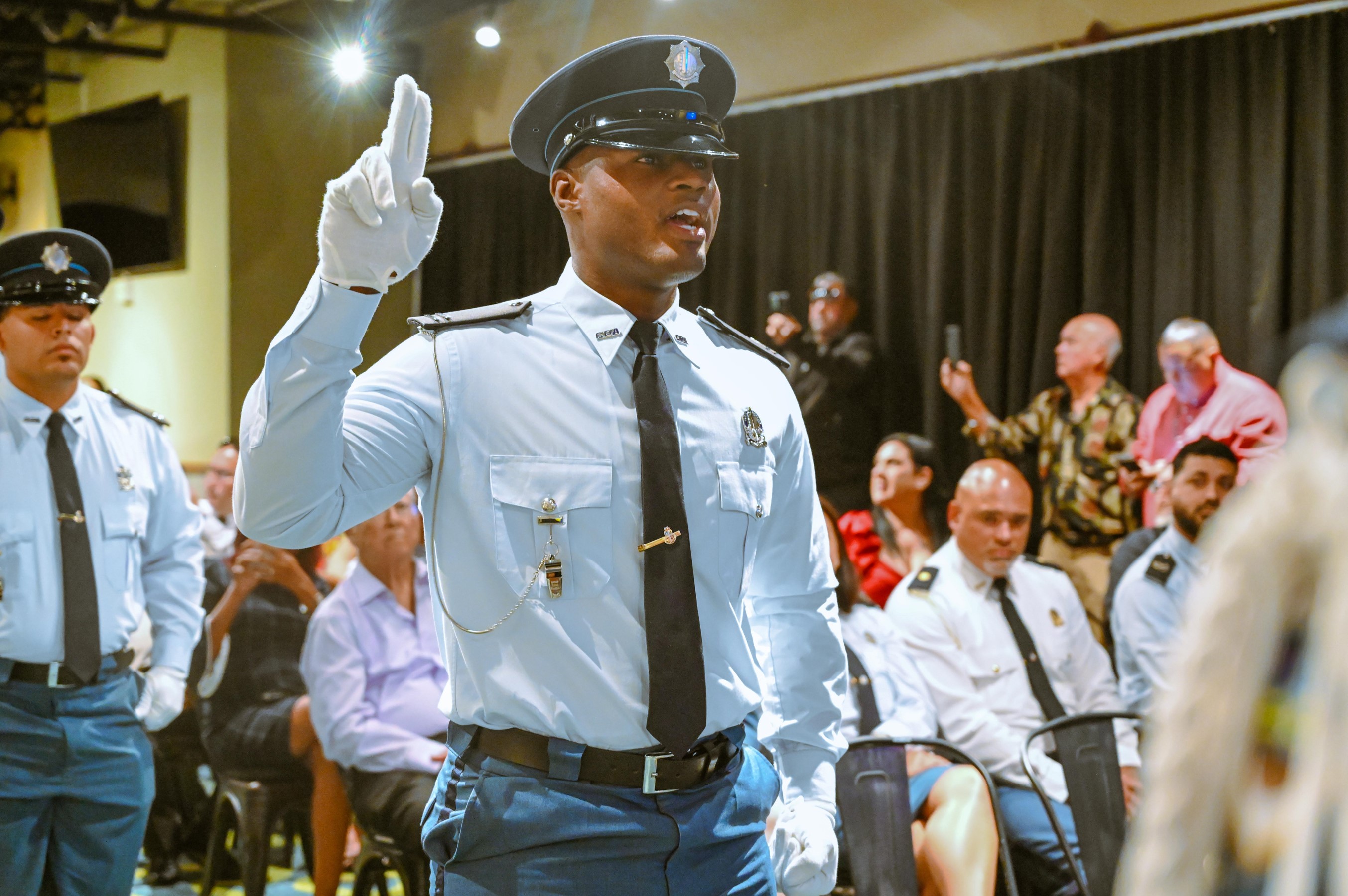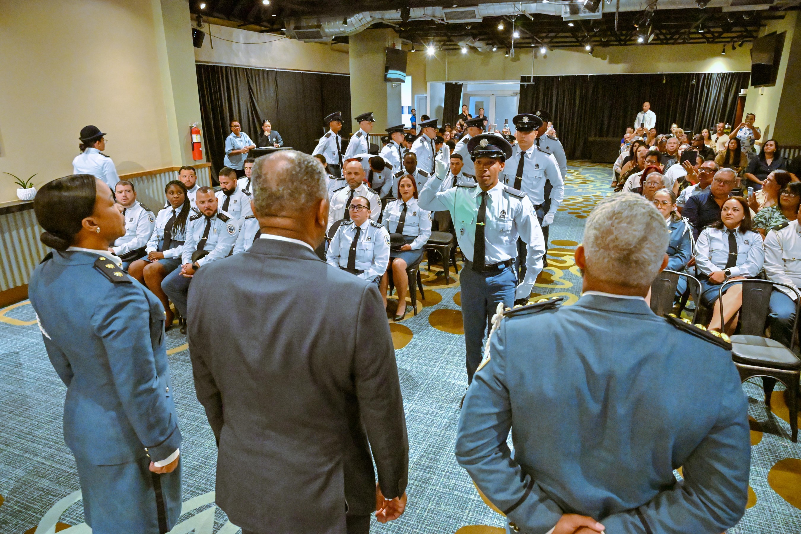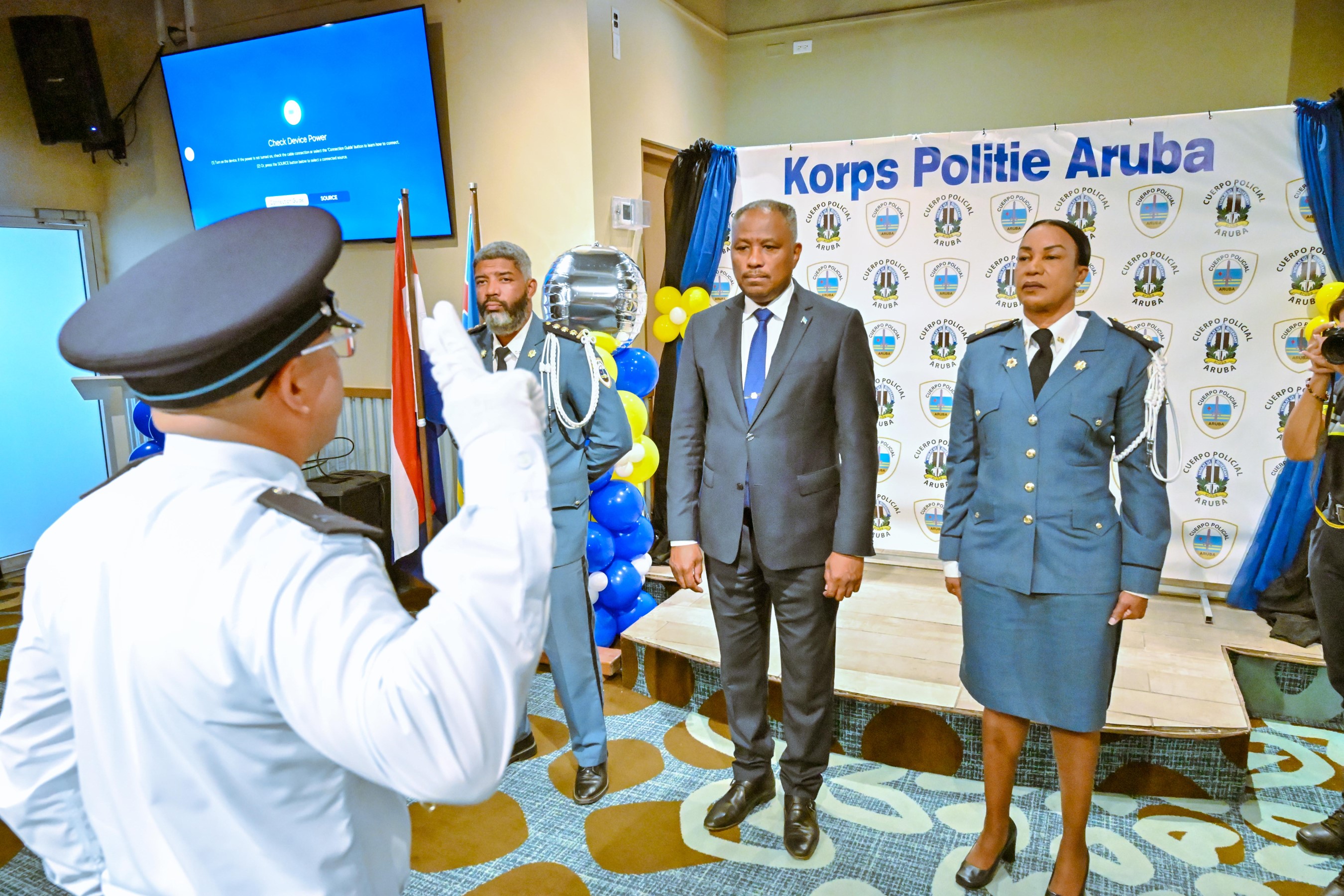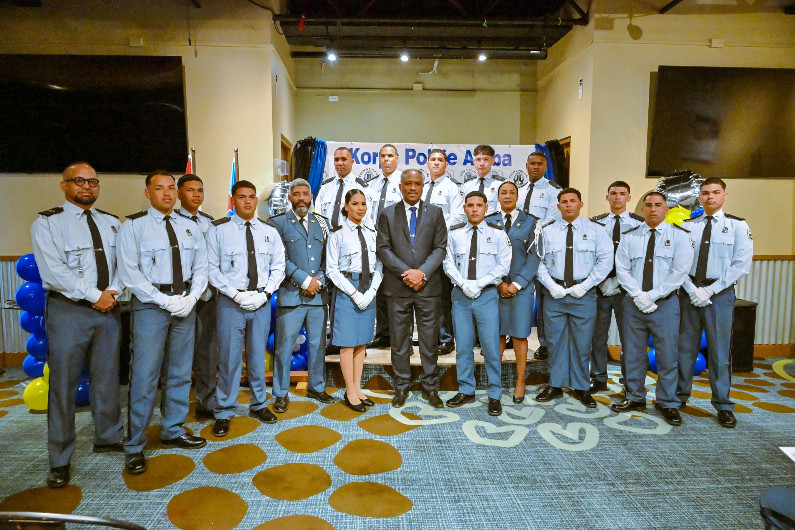 ORANJESTAD (AAN): Diahuebs mainta a tuma lugar un ceremonia protocolario den e ballroom den Double Down na J.E. Irausquin Blvd. Den presencia di Minister di Husticia, Integracion y Transporte Publico mr. Arthur Dowers, altocomisario di Polis drs. Ramon Arnhem, Hefe di Scol di Polis E.J. Watty Vos sr. Sherina