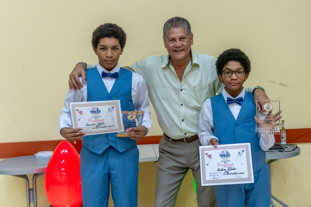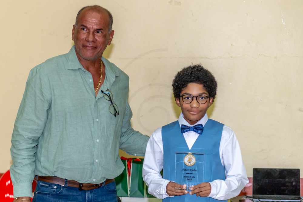 Presidente di Aruba Taekwondo Bond "ARTBO" Sr. Moises Fernandez a entrega e premio na e atleta di aña Aidan Klaber.