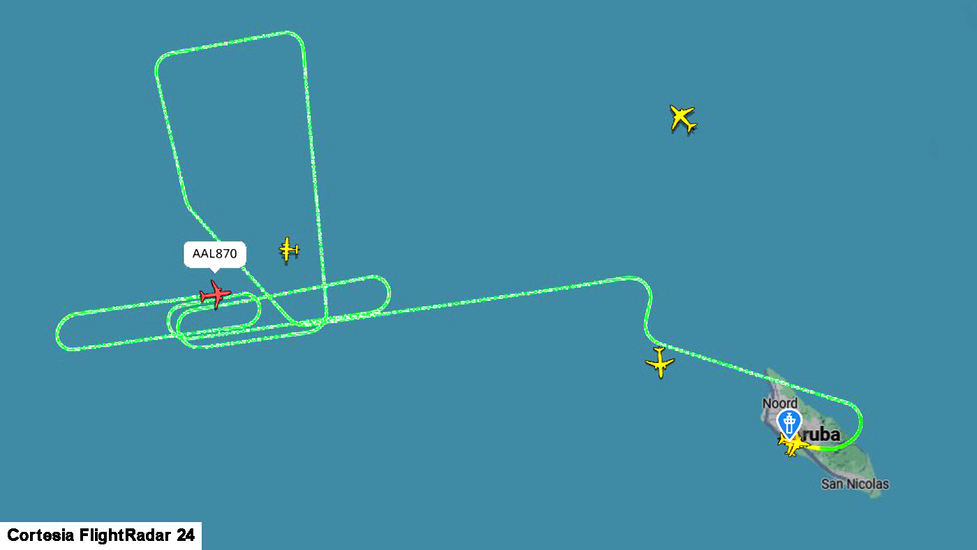 Mientras tanto, e vuelo AA870 a keda bula pa como 2:20 ora largo pabao di Aruba, ta ‘kima’ jetfuel pa asina haci e tankinan mas bashi, pa por haci un aterizahe mas safe.