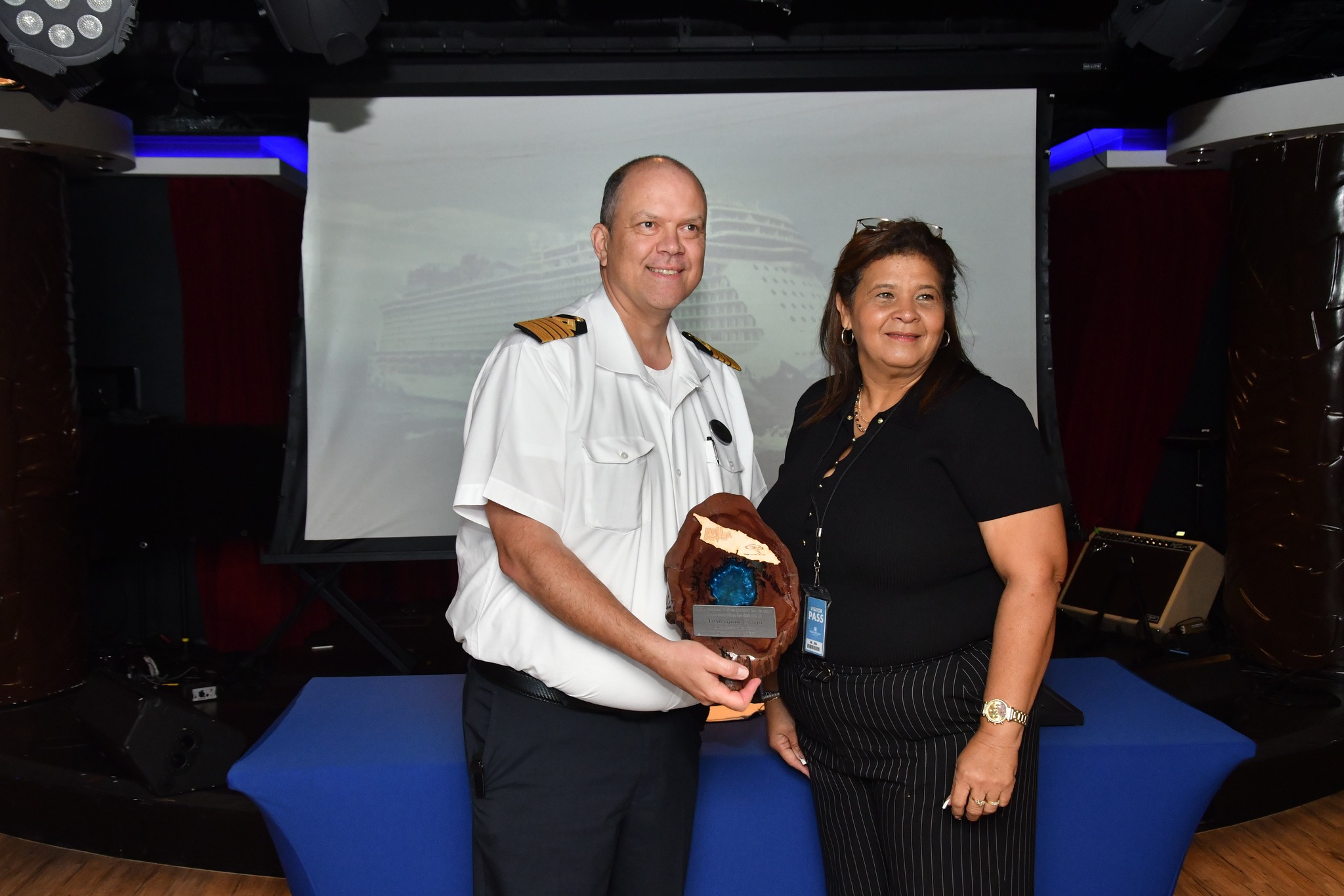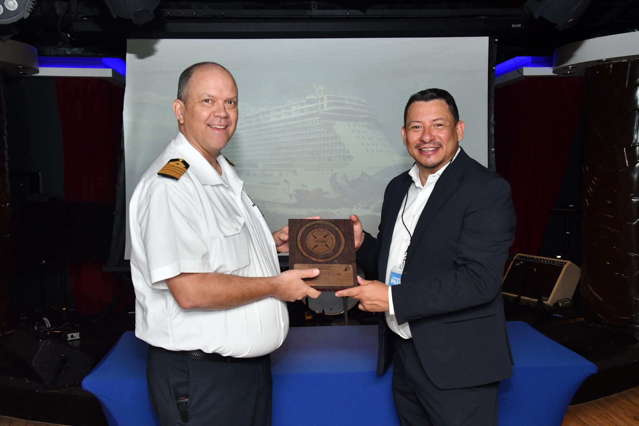E delegacion a ricibi un bon bini caluroso abordo di Norwegian Escape, unda tabatin un ceremonia tradicional di intercambio di plaquette. E intercambio aki ta un custumber maritimo estableci den cual e capitan di e barco y representantenan di e waf ta intercambia plaquette conmemorativio pa simbolisa amistad, colaboracion, y celebracion di e prome bishita di e barco na e destinacion.