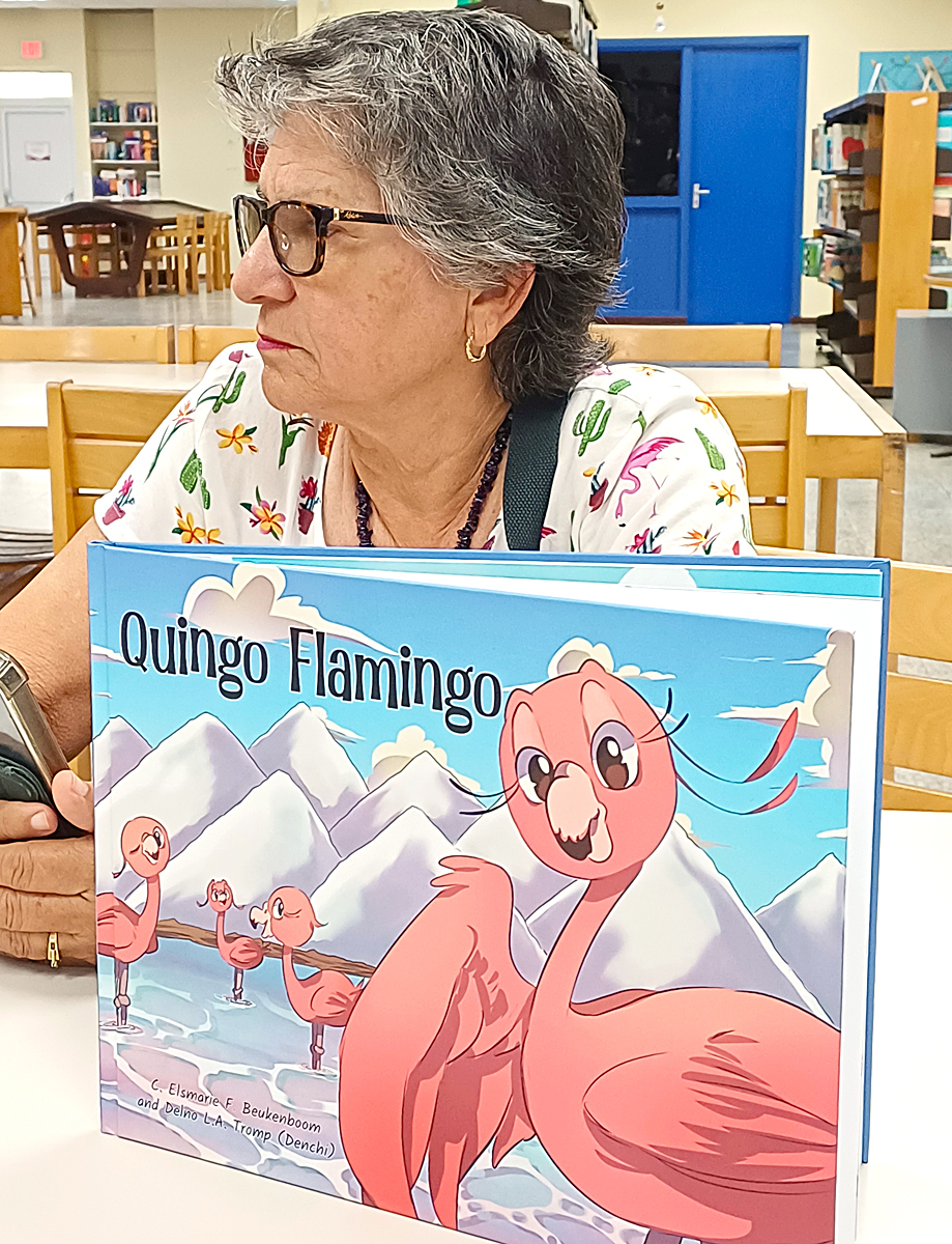 Escritornan Elsmarie Beukenboom y Delno (Denchi) Tromp a presenta nan buki nobo na hefe suplente di Biblioteca Nacional Aruba, señora Lilian Semeleer, titula ‘Qingo Flamingo, un publicacion cu ta promove lectura y cultura local di Bonaire.