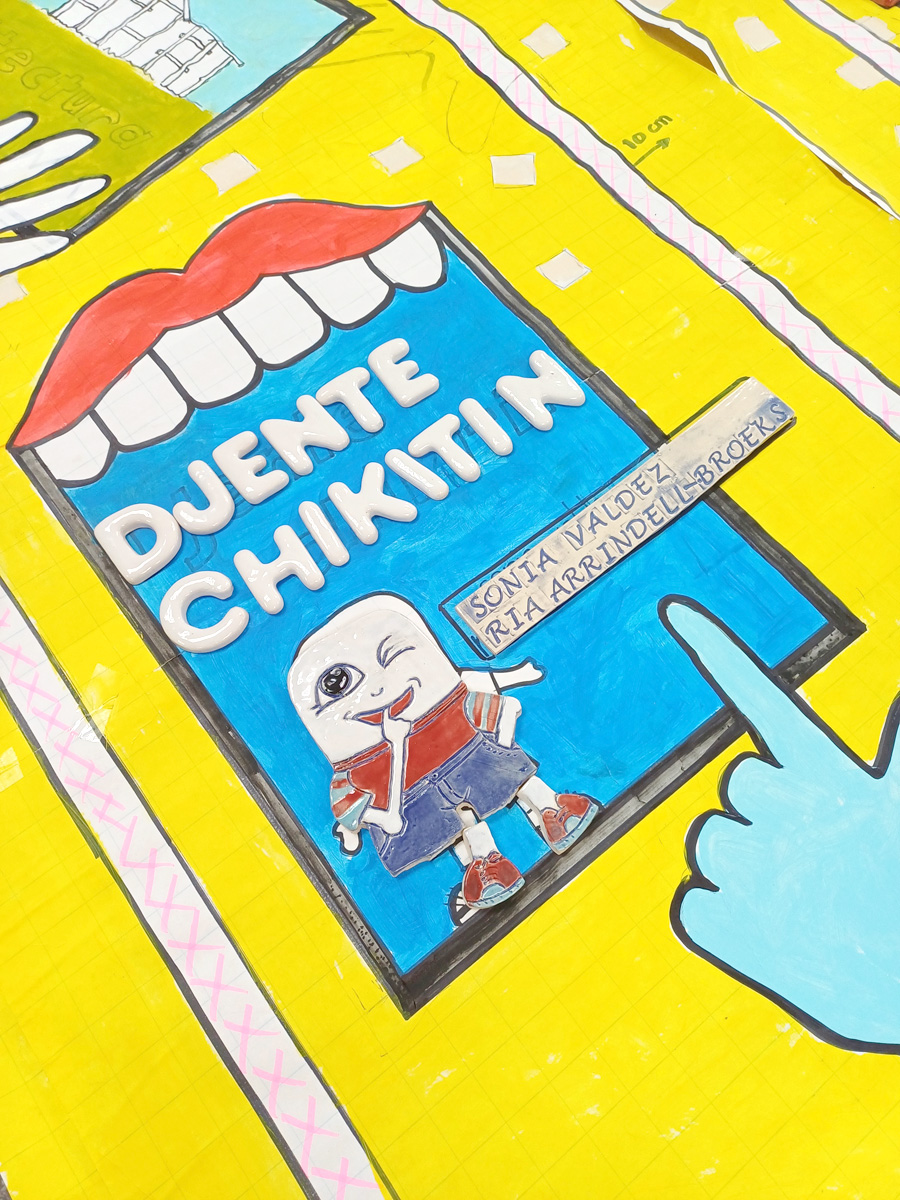 Esaki pa un ‘zitje’ special bou palo di Watapana na e edificio principal na Playa. Artesanonan cu a pone man na obra ta: Donna Oduber, Livia Solognier, Dolores Machado, Dulce Goedgedrag, Deta Denters, Mariela Geerman, Bernadette Schouten y Grace Irausquin, Glenda Croes y ilustrador Ria Arrindell-Broeks. Empleadonan di biblioteca a yuda tambe den trahamento di e obra special aki. Pues un proyecto comunitario pa tur bishitante di biblioteca. Un danki grandi na tur!
