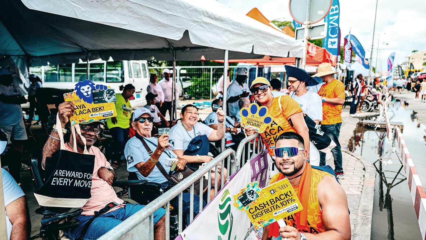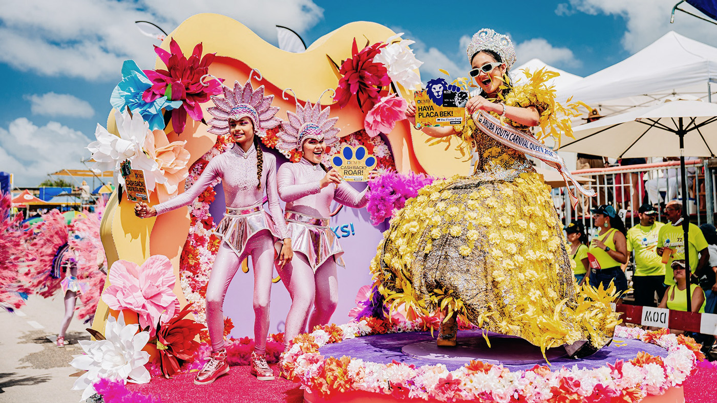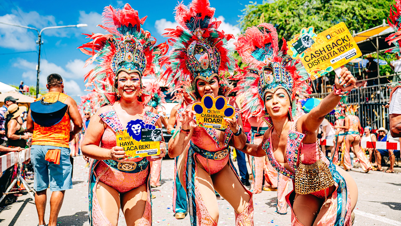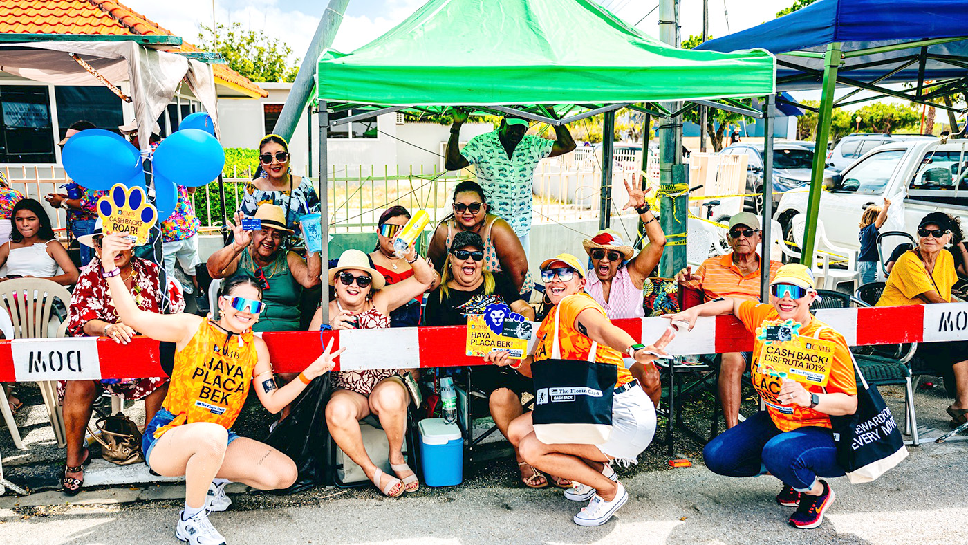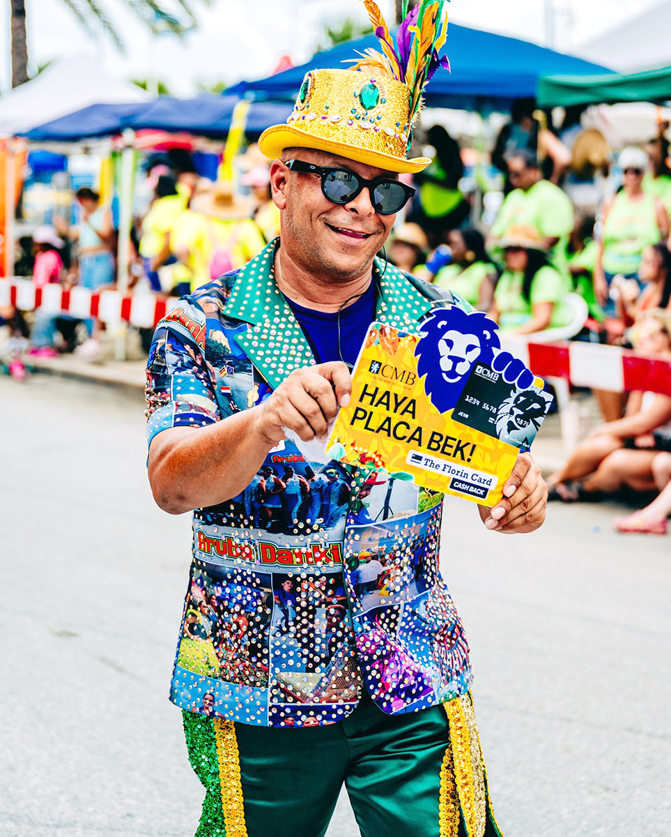 ORANJESTAD (AAN): Durante ultimo weekend di Parada di Carnaval, comunidad di Aruba por a mira e team alegre, informativo, y sigur yen animo di CMB Bank riba caya.