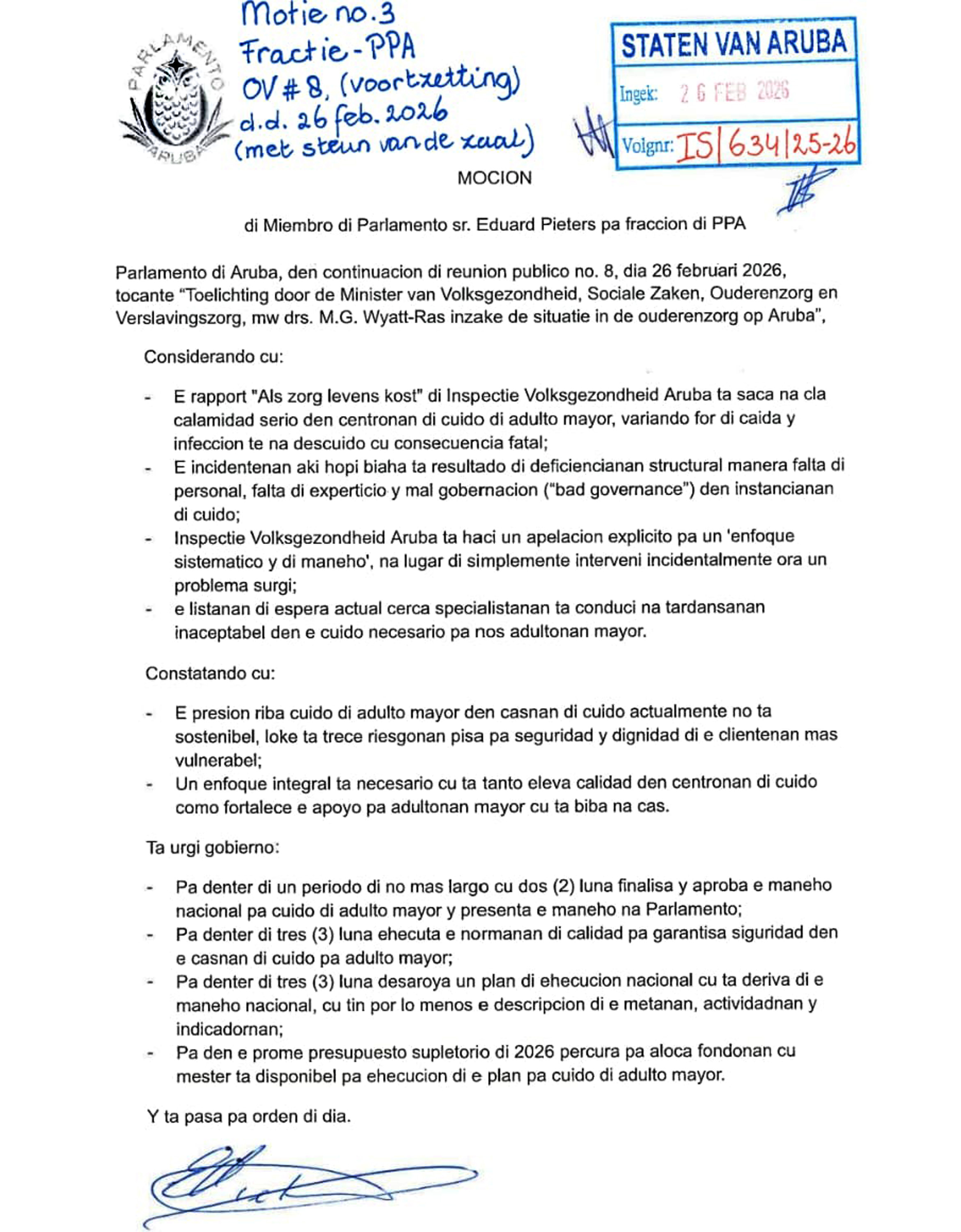 ORANJESTAD (AAN): Parlamentario Eduard Pieters di fraccion PPA a presenta un mocion fuerte durante reunion publico di diahuebs tocante situacion di cuido di adulto mayor na Aruba. E mocion tabata presenta cu argumento solido y a haya aprobacion tambe di henter cuerpo di Parlamento.