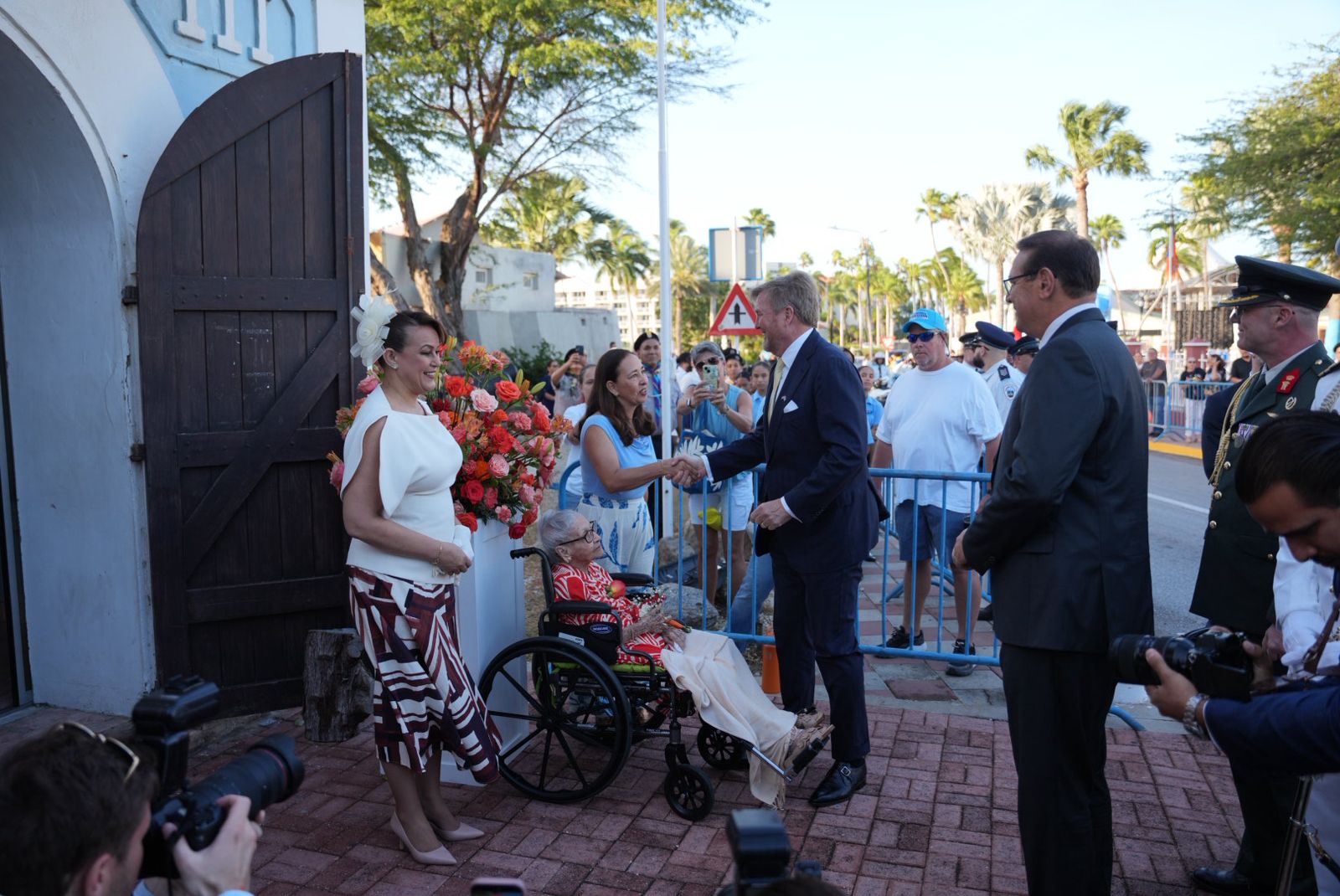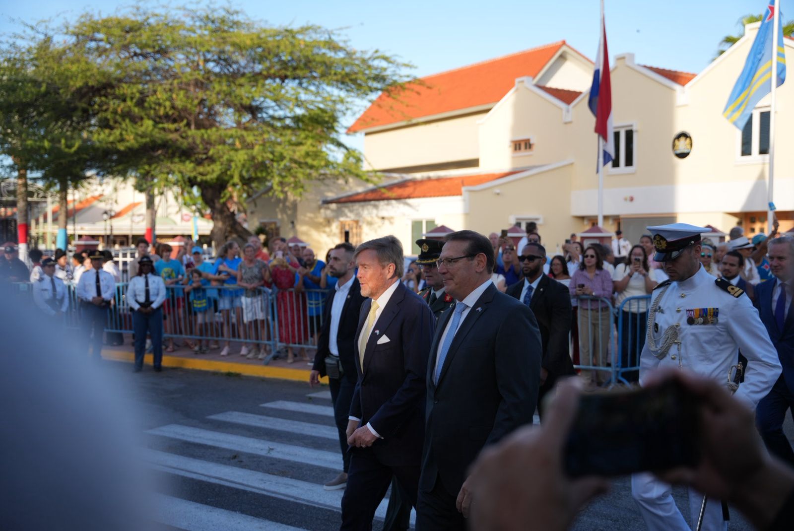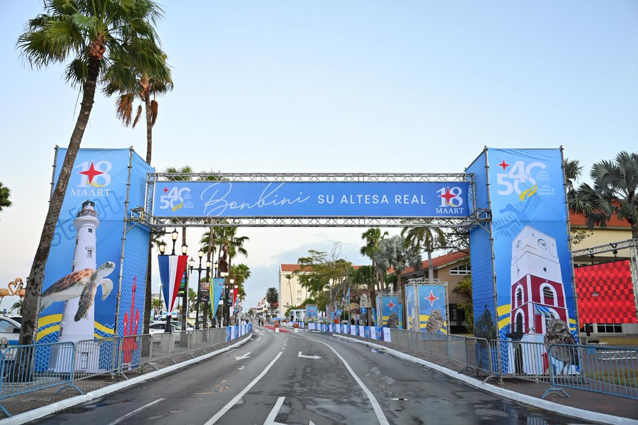 Despues di e encuentro na Fort Zoutman, Su Mahestad a sigui den direccion di Bestuurskantoor pa continua cu e programa oficial di e celebracionnan nacional. Na caminda pa Bestuurskantoor, diferente grupo di padvinder a para pa saluda e delegacion real, mientras cu musica di steelpan a crea un ambiente festivo durante e celebracionnan.