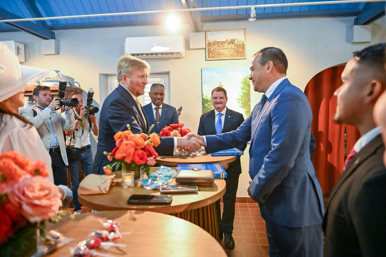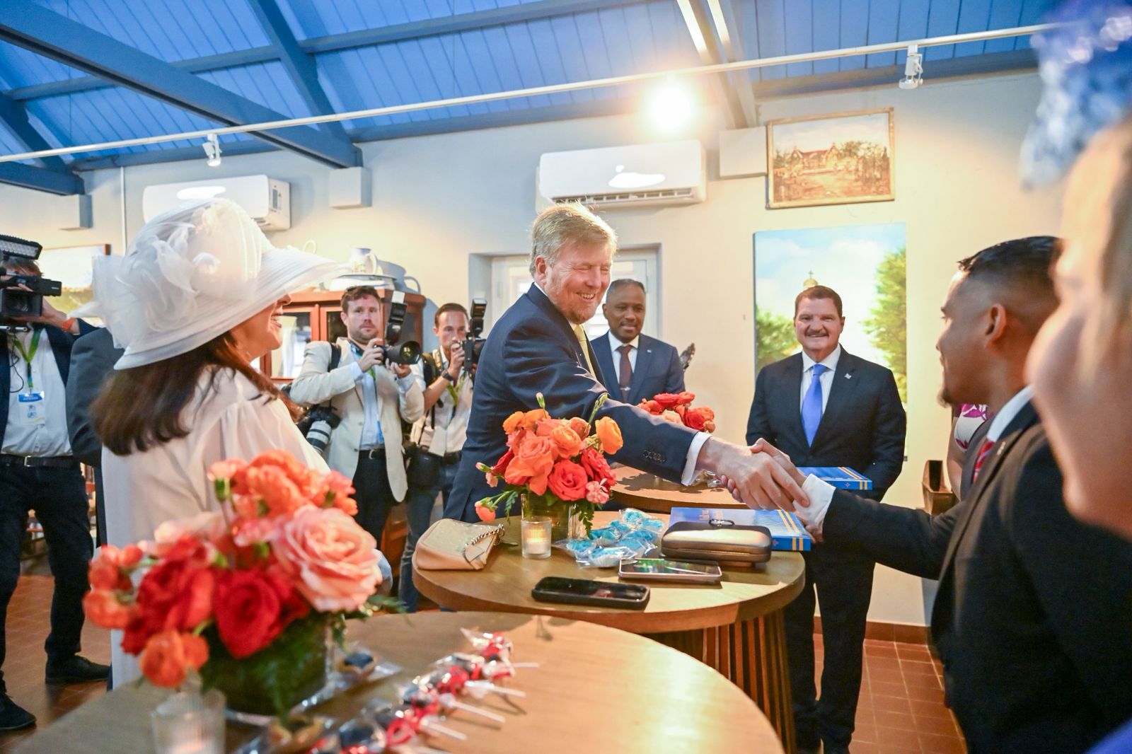 encontra cu lidernan di fraccionnan di Parlamento di Aruba y e Conseho di Minister. Na su yegada, e representantenan di Comision Celebracion Dianan Nacional (CCDN) a ricibi Su Mahestad.