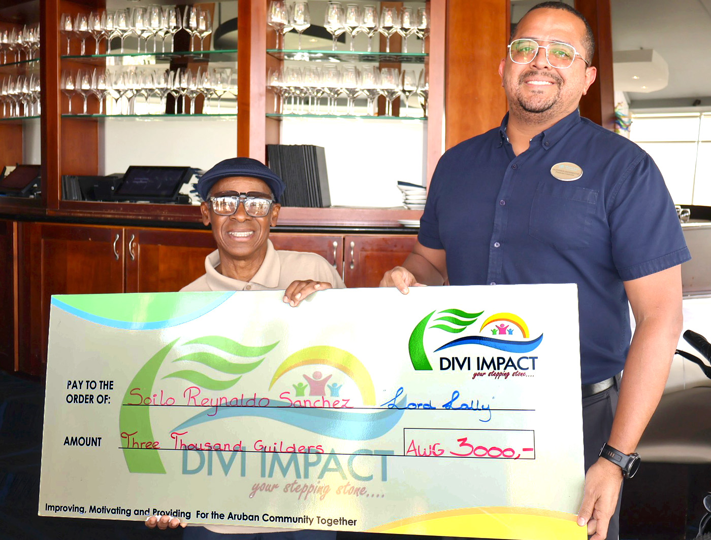 Lord Lally ORANJESTAD (AAN): Durante un ceremonia special, Divi Impact Foundation a presenta un cheque na nan empleado Soilo Sanches,