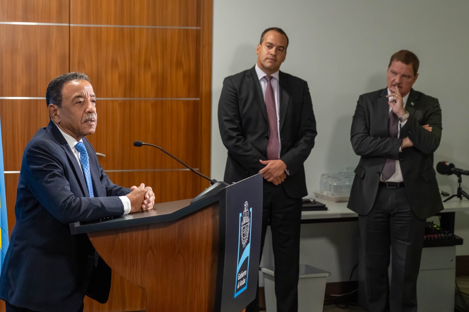 ORANJESTAD (AAN): Minister di Finansa, Asunto Economico y Sector Primario, Geoffrey Wever, acompaña pa Prome Minster Mike Eman y Minister di Infrastructura, Rene Herde, a anuncia oficialmente e apertura di un destaho publico pa selecciona un bureau di arkitectura pa elabora un diseño integral pa e proyecto di embeyecemento di Wilhelminastraat y su vecindario.