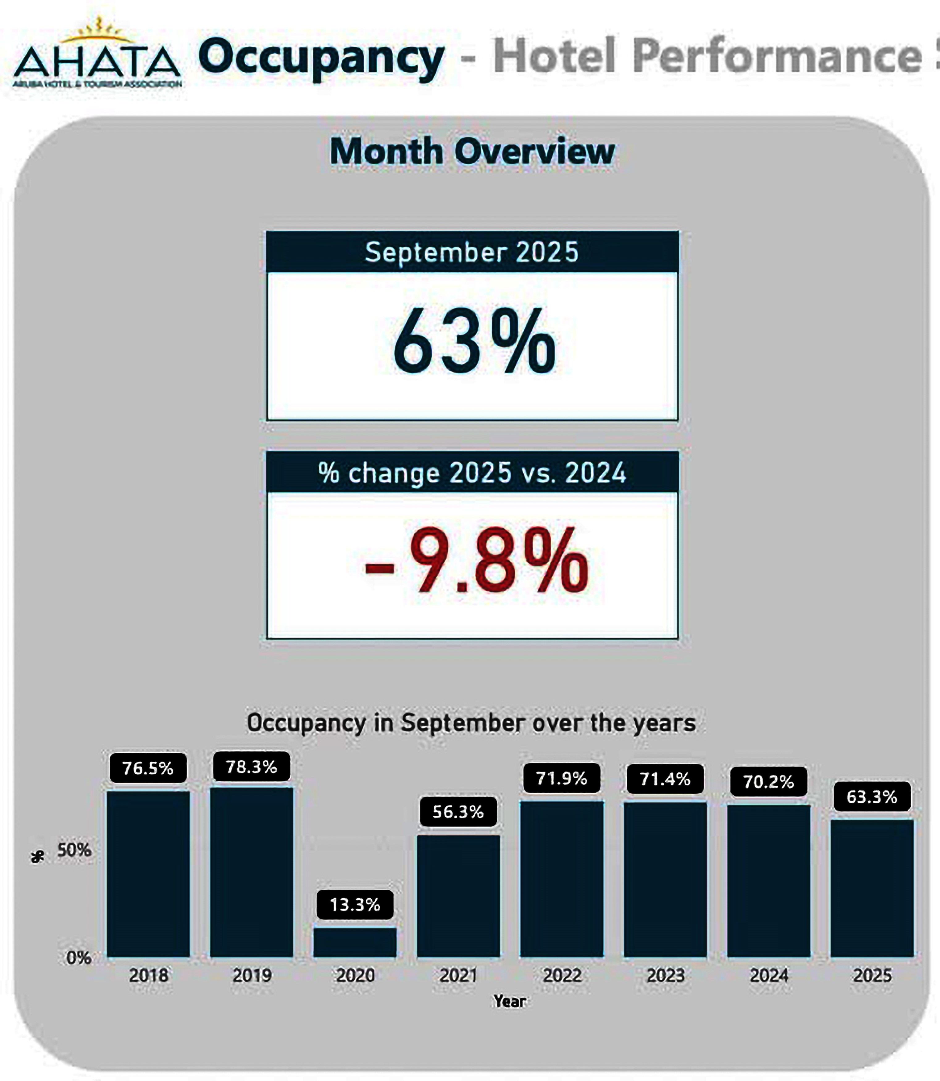 Asociacion AHATA cu ta representa e Hotelnan na e isla, a confirma cu Ocupacion promedio a baha te 63% na September. E ta 10% menos (pa ta preciso: 9,8 porciento) cu un aña pasa. Aunke cu September historicamente tin un dip y a logra mantene RevPAR, e cifra aki ta preocupante.