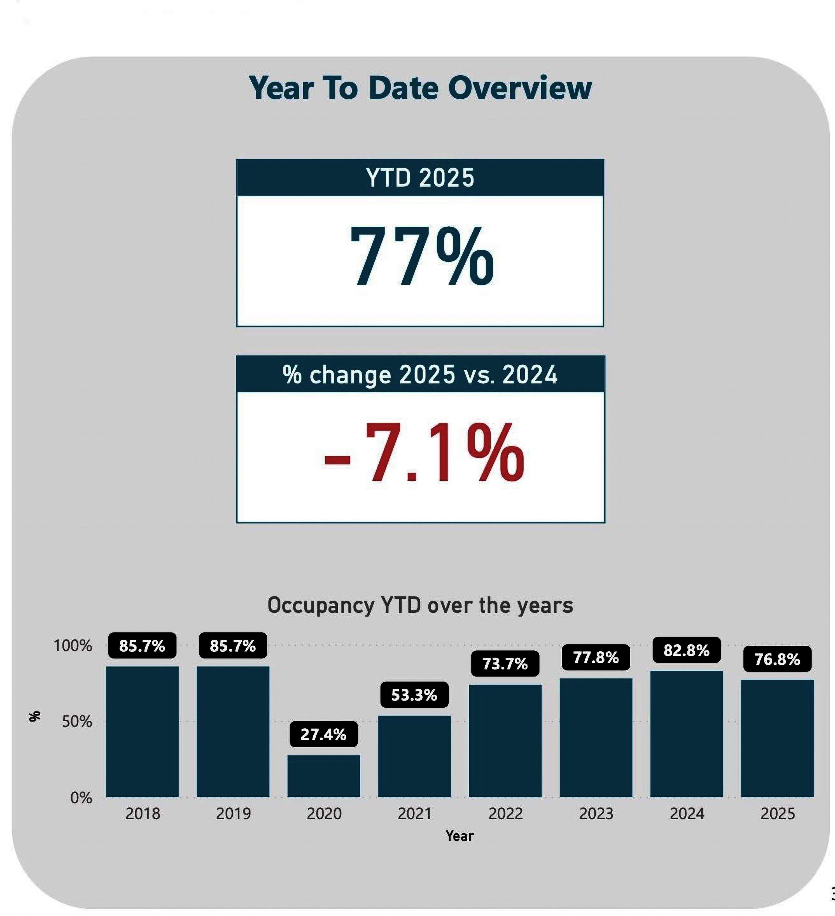Un luna prome, esta na Augustus 2025, e grado di ocupacion tabata 74%. E proyeccionan di AHATA pa grado di ocupacion tambe a worde ahusta y ta mustra cu di dos mitar di aña e ocupacion lo ta mas abao di loke na comienzo a worde proyecta.
