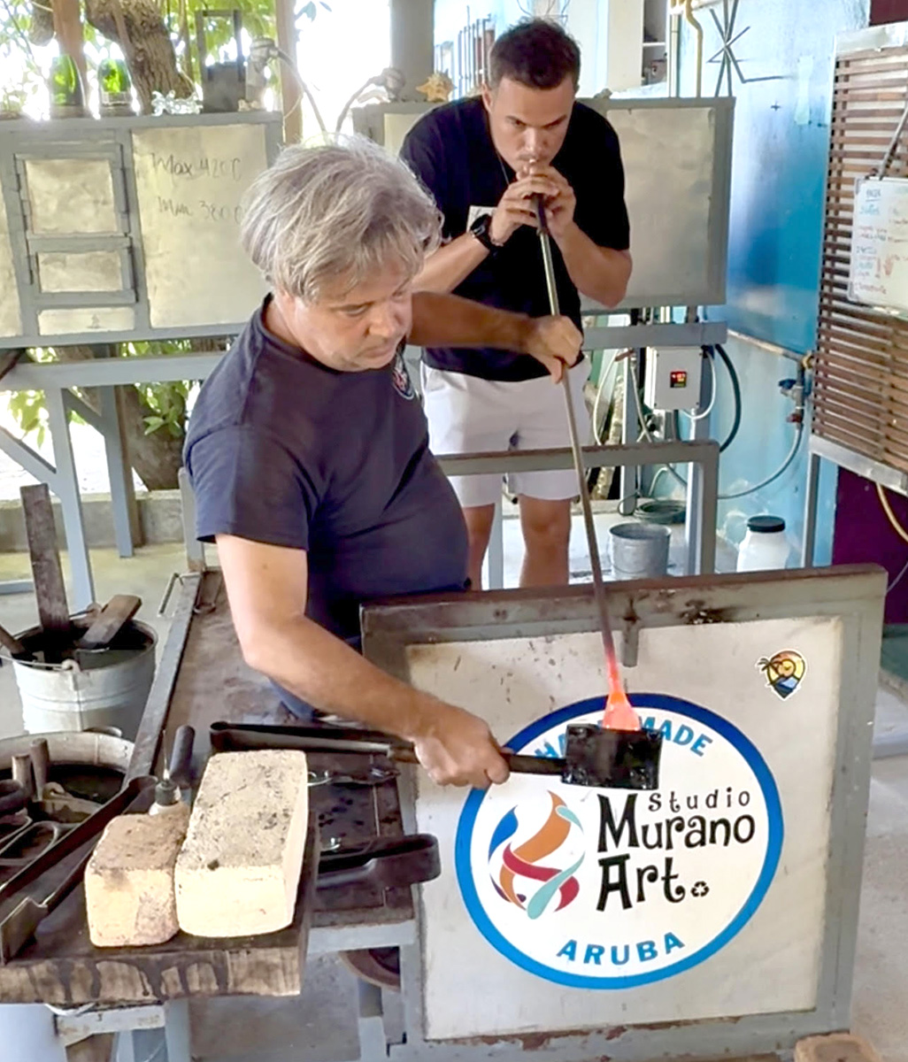 Un bus di Fofoti Tours a bay busca e grupo na YMCA Dakota anto e chauffeur Julissa tabata hopi bon den yuda asisti tur hende subi y baha e bus. E prome stop tabata ta Murano Art Studio na Ayo, na unda cu e doñonan Juliano y Patricia a ofrece e bishitantenan un demostracion di glassblowing.