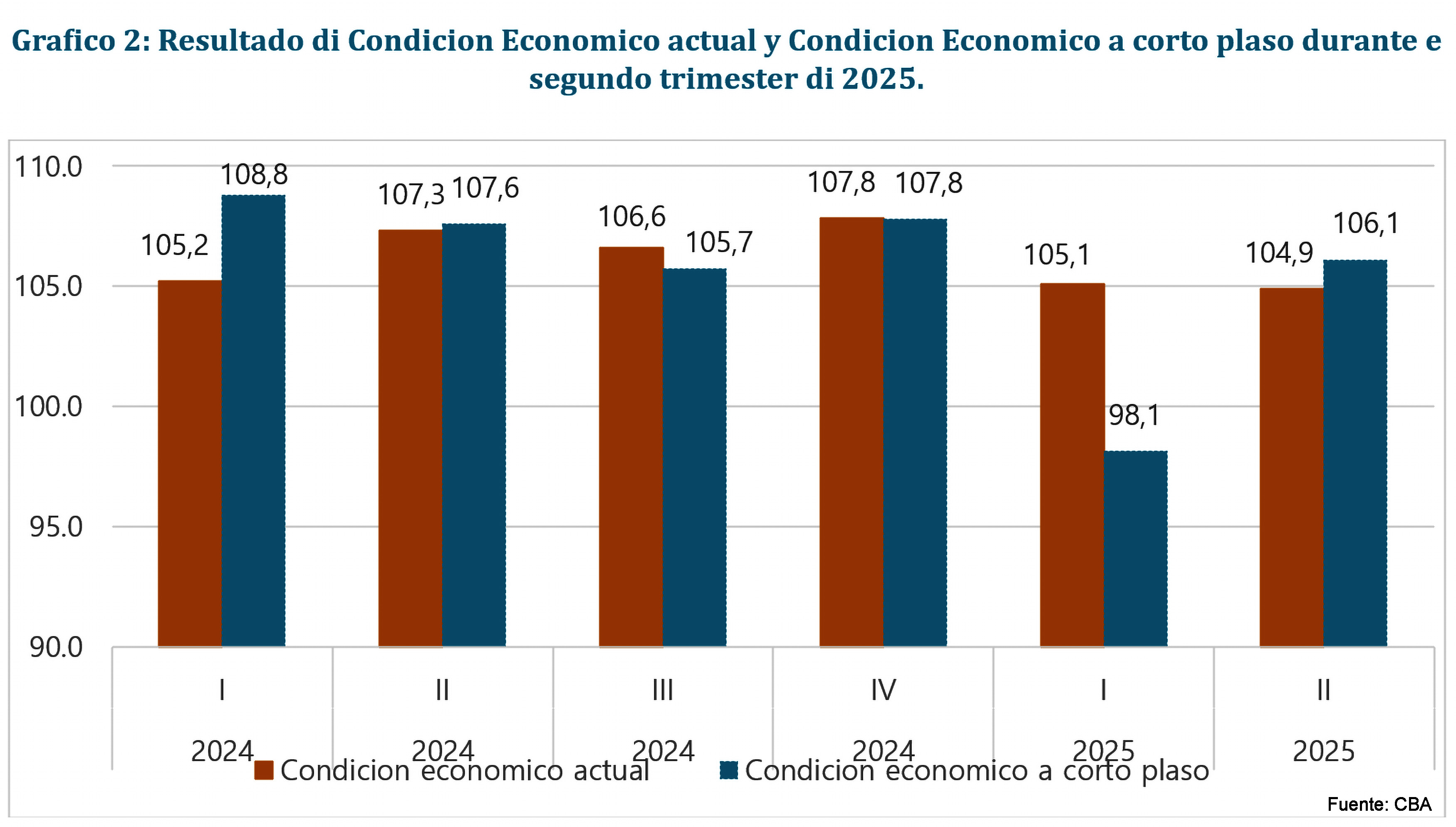 E indice di condicion economico a corto plaso a subi cu 8,0 punto di indice te na 106,1, mientras cu e indice di condicion economico actual a baha cu 0,2 punto di indice te na 104,9 den e segundo trimester di 2025 (mira Grafico 2).