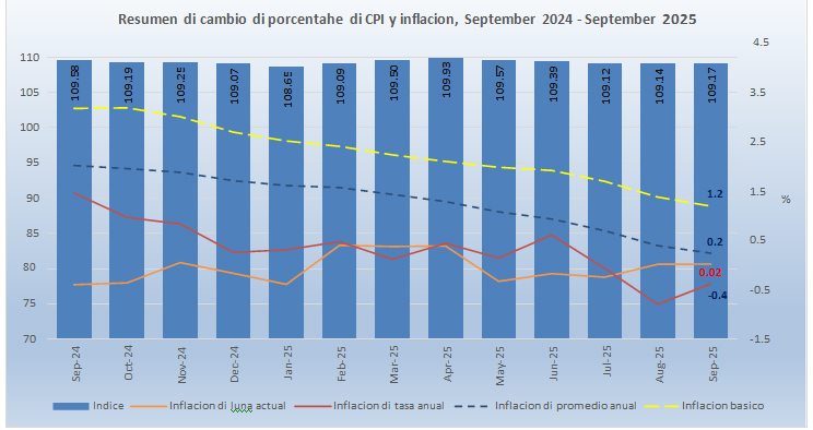 E cambio di e CPI pa e ultimo diesdos (12) lunanan (September 2024 te cu September 2025) ta -0.4%, un caida di 1.9 punto di porcentahe (ppt) compara cu e periodo corespondiente di aña pasa (1.5%).