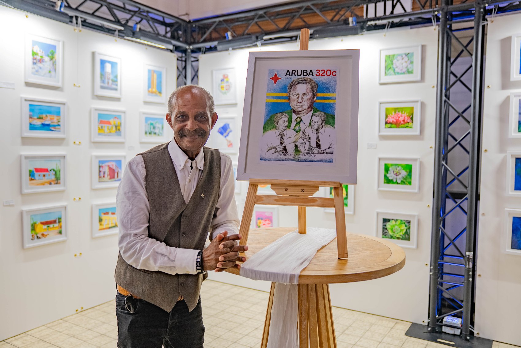 ORANJESTAD (AAN): E stampia conmemorativo dedica na Henny Eman, prome Minister President di pais Aruba, no ta solamente un representacion visual, sino un interpretacion profundo di su caracter y legado, segun artista Nigel Matthews, responsabel pa e diseño.