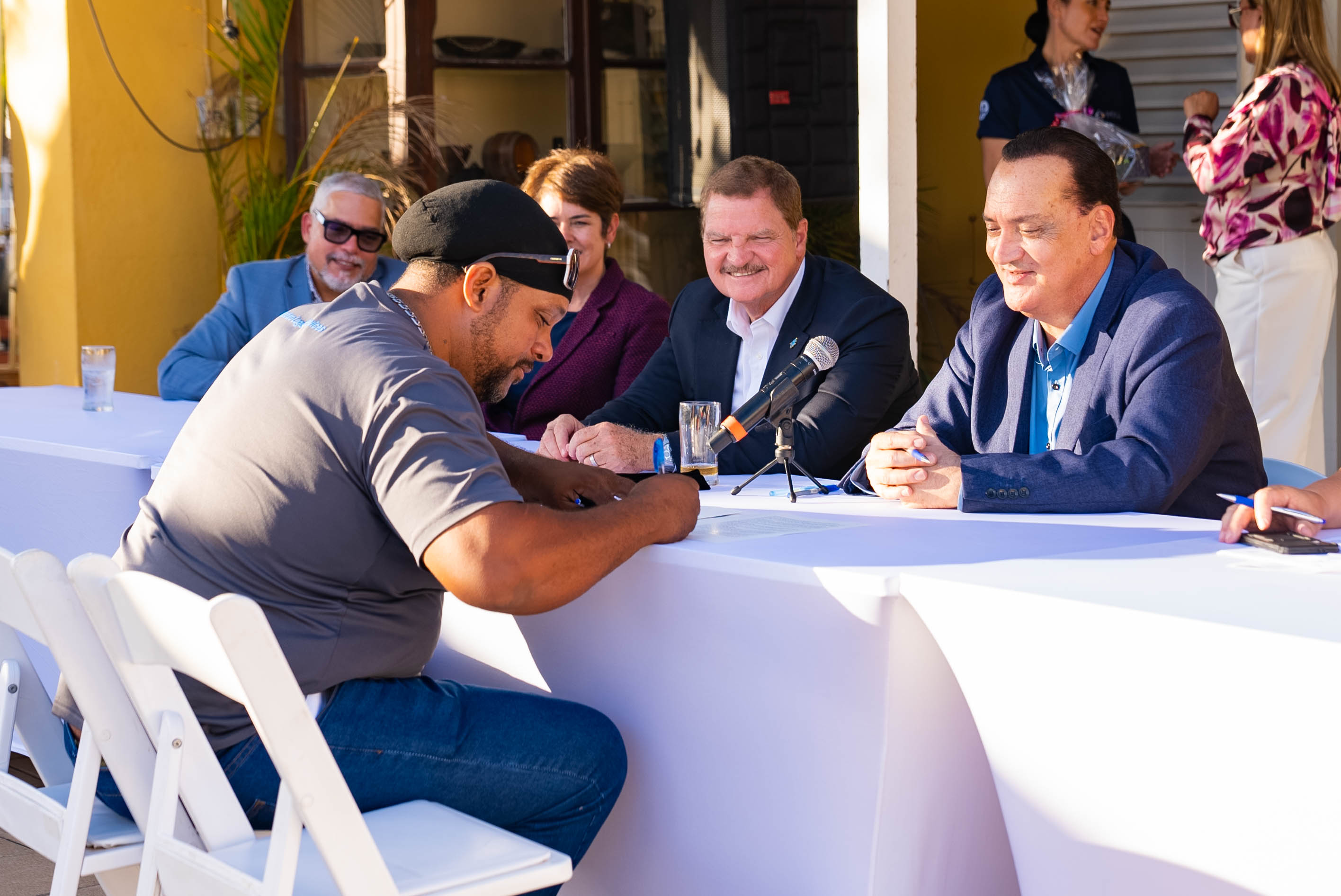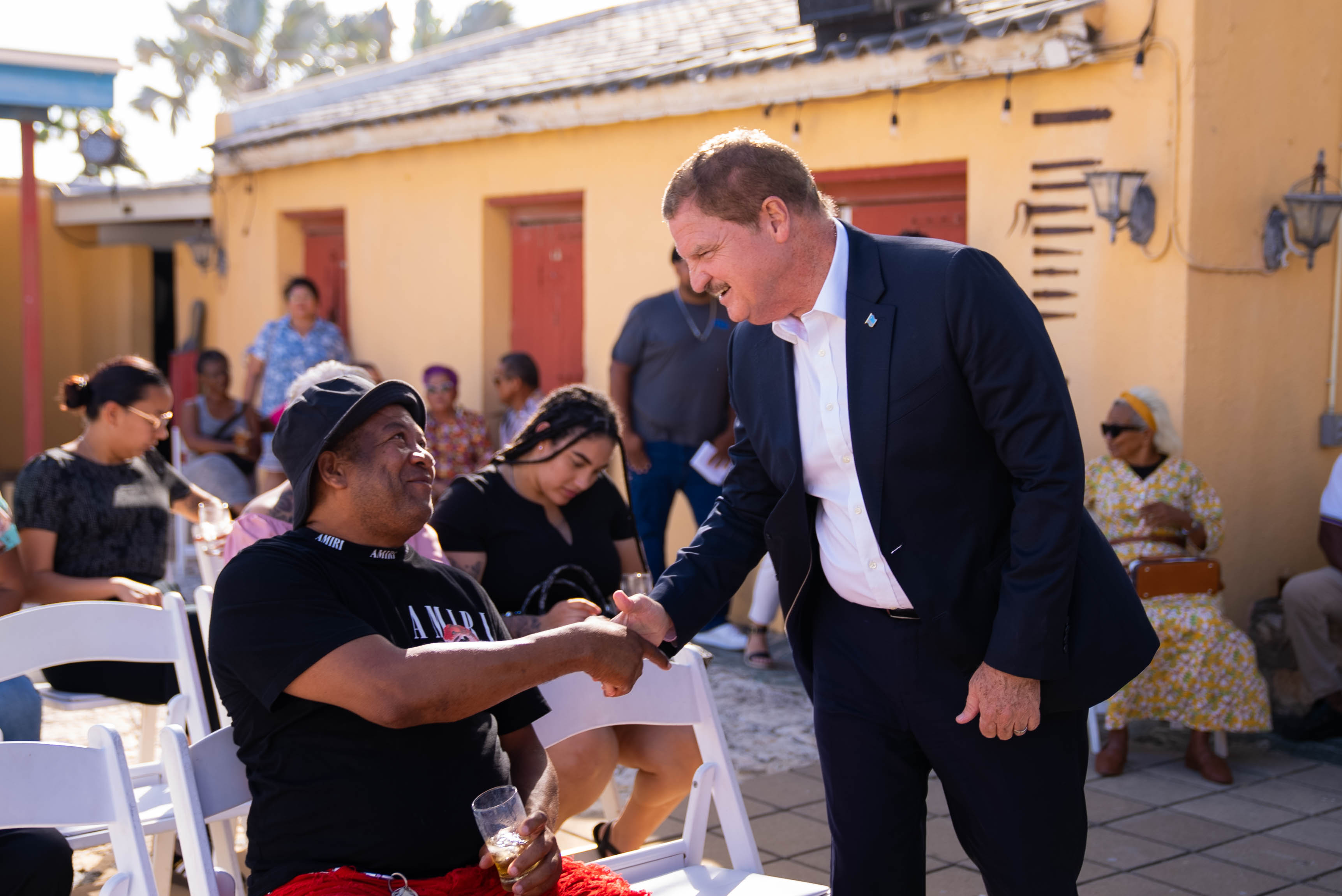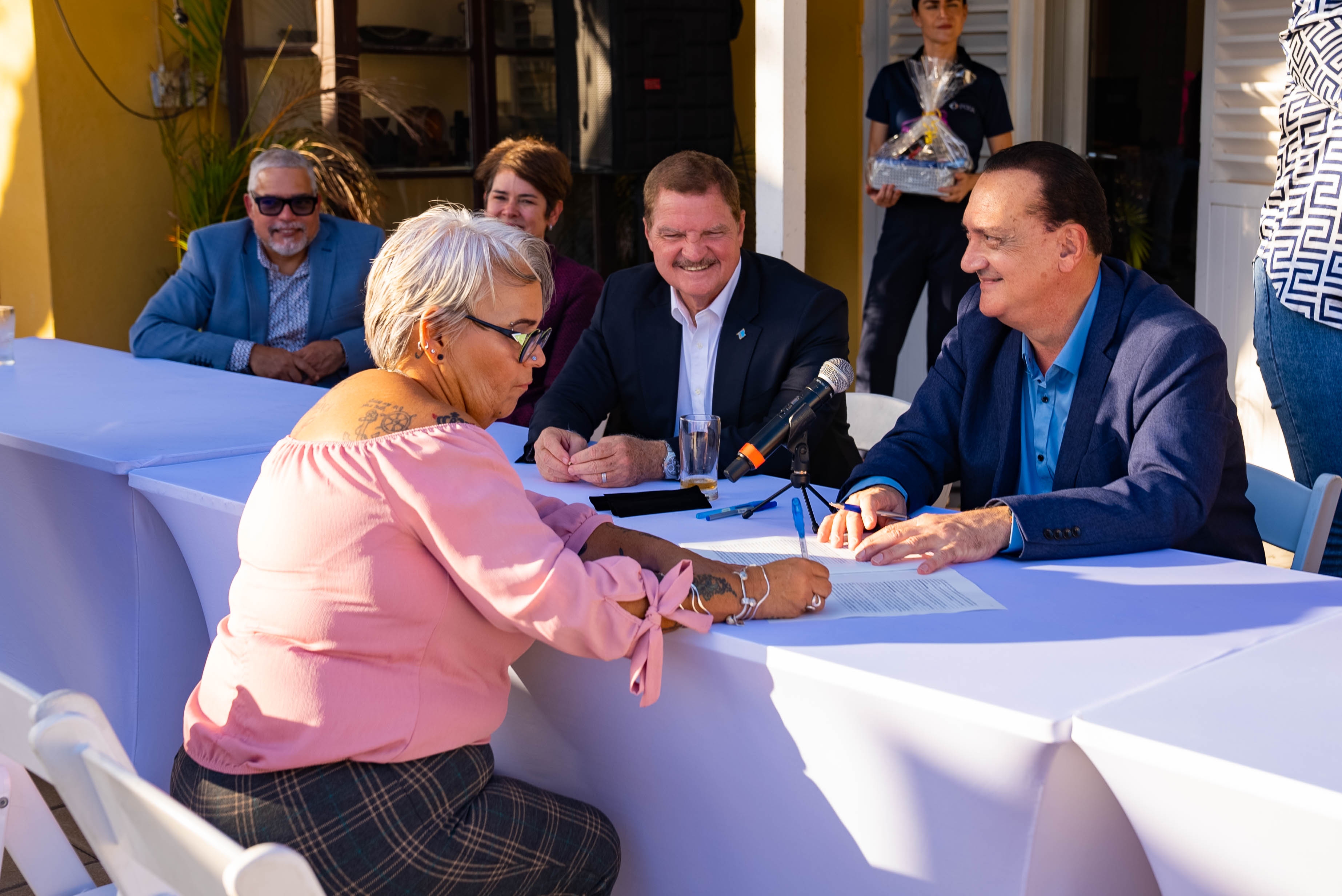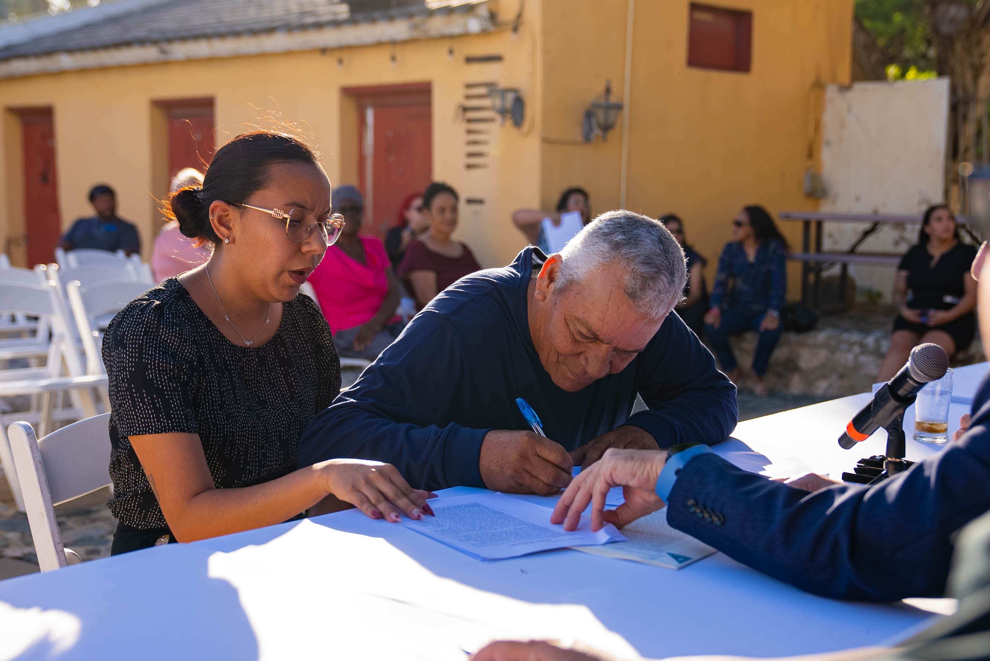 E ceremonia a tuma lugar den presencia di Minister di Infrastructura drs. Rene 'Baba' Herdé, representante di FCCA, funcionario di DIP y DLV, notario y famia di e beneficiario nan.