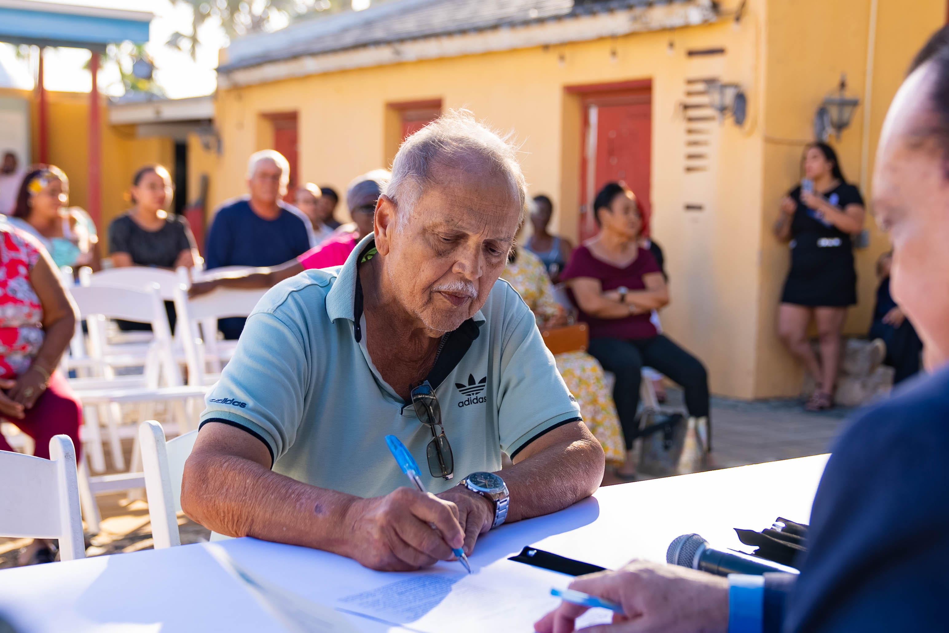 ORANJESTAD (AAN): Durante un ceremonia especial na Fort Zoutman, 20 ciudadano a ricibi e acta oficial di erfpacht di nan cas, un paso importante cu finalmente ta reconoce nan como propietario legal di e vivienda caminda nan a biba pa hopi aña.