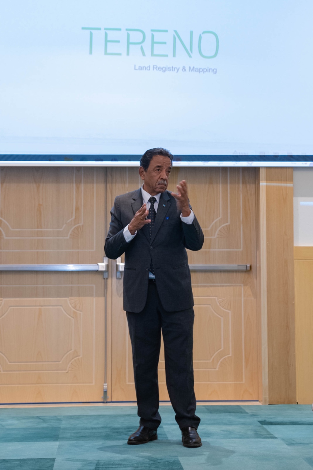 Sr. Louis Boekhoudt di DLV a habri e presentacion cu un palabra di bon bini y a gradici tur stakeholders presente pa nan presencia. E la sigui na menciona con un plataforma manera TERENO Connect lo trece automatisacion y innovacion na DLV y cu acceso na informacion cadastral lo simplifica e procedura di registración.