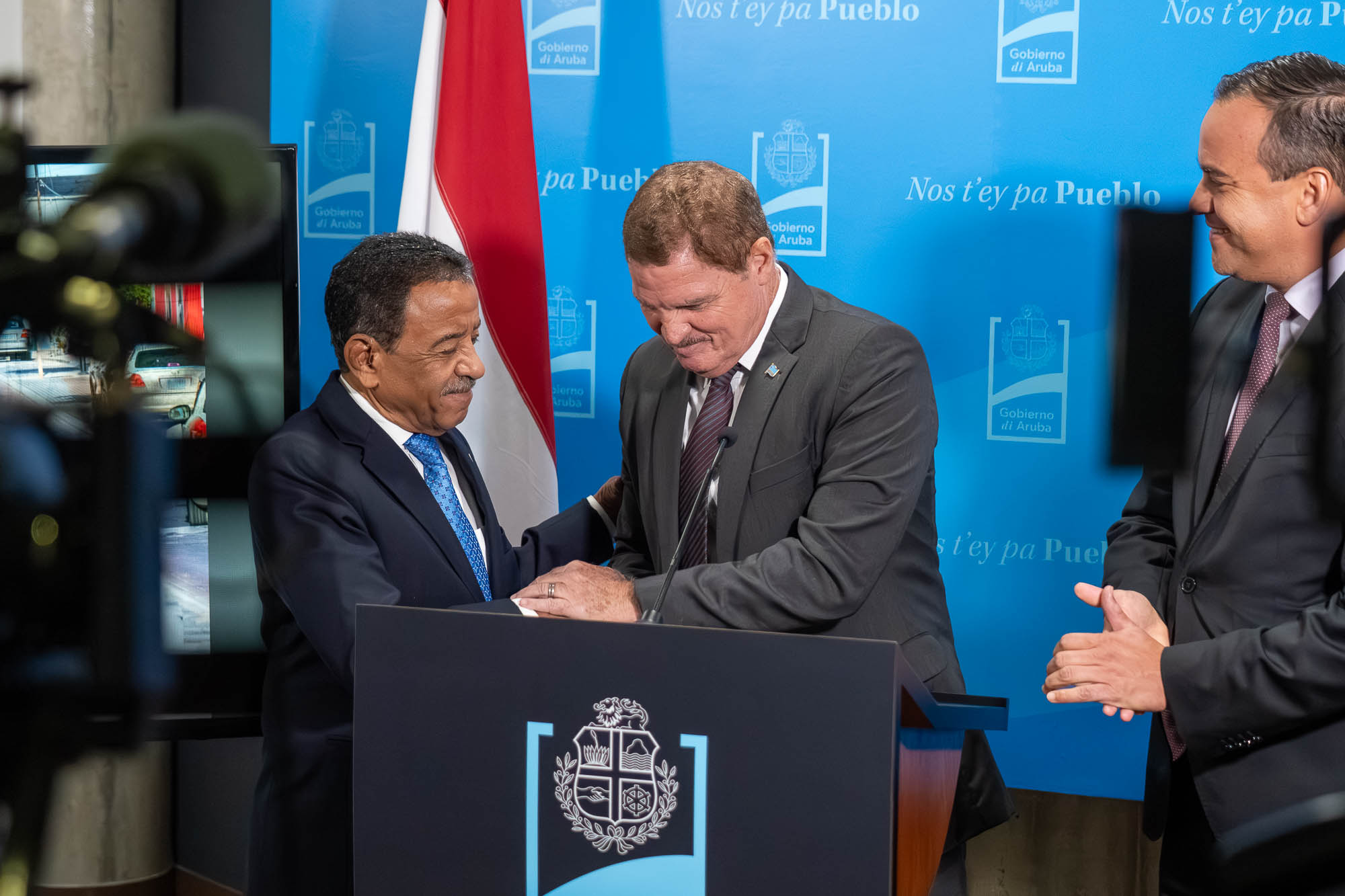 ORANJESTAD (AAN): Durante un conferencia di prensa diamars merdia hunto cu Prome Minister mr. Mike Eman y Minister di Finansa mr. Geoffrey Wever,