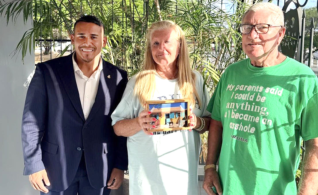 ORANJESTAD (AAN): Recientemente Ministro di Turismo, Wendrick Cicilia hunto cu Parlamentario Carlos Bermudez, a pasa bishita e pareha turista, Walter y Joellyn Garside, debi na e hecho cu nan ta observando nan di 34 aña ta bishitando e isla.’
