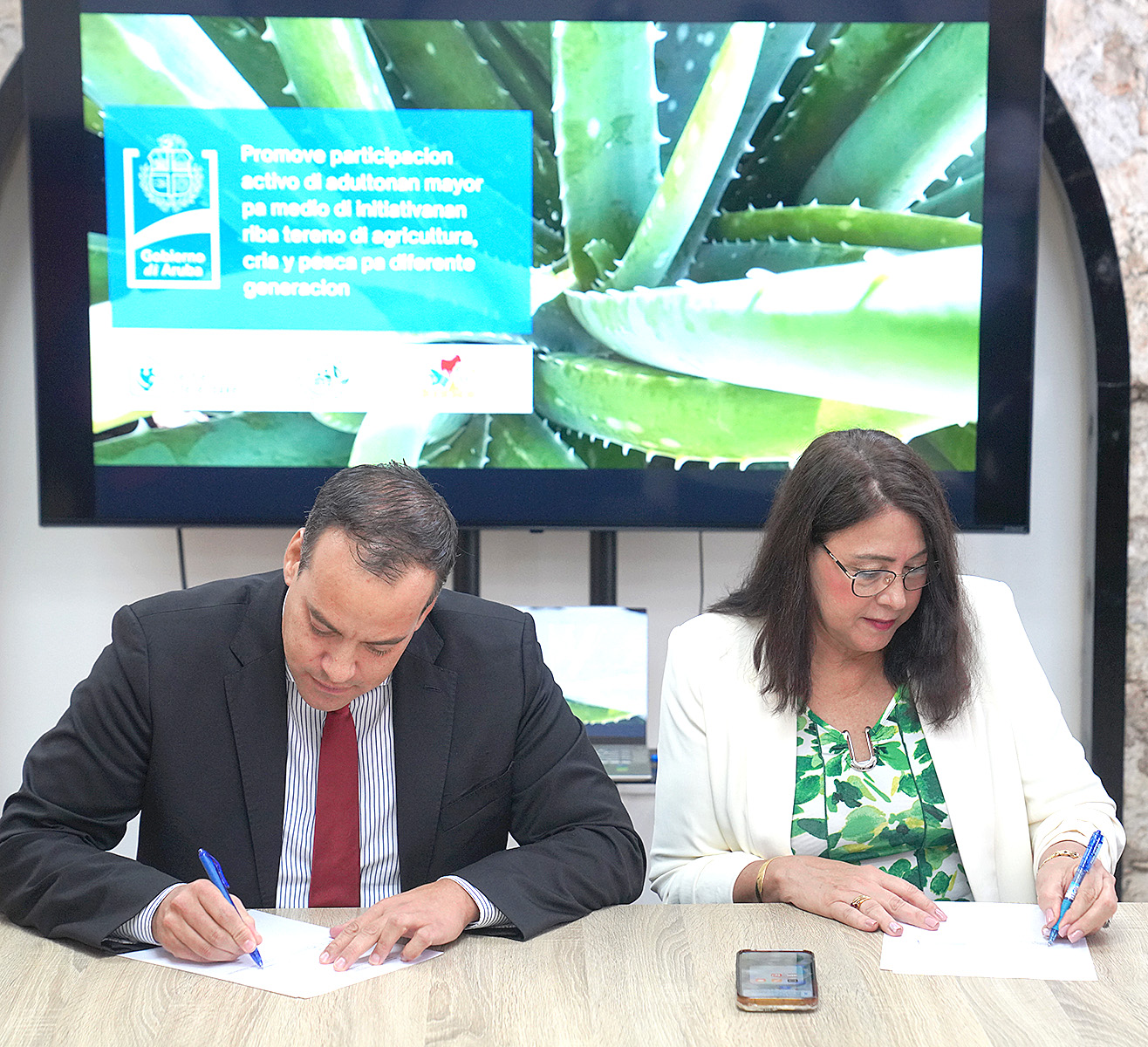 ORANJESTAD (AAN): Directie Ouderenzaken (DOZ) y Departamento di Agricultura, Cria y Pesca (Santa Rosa), den presencia di Minister di Salubridad, Asuntonan Social, Cuido di Adulto Mayor y Maneho di Adiccion, señora Melvin Wyatt-Ras y Minister di Finansa, Asunto Economico y Sector Primario, sr. Geoffrey Wever, a firma un acuerdo di cooperacion pa uni forsa pa promove bienestar di adultonan mayor na Aruba.