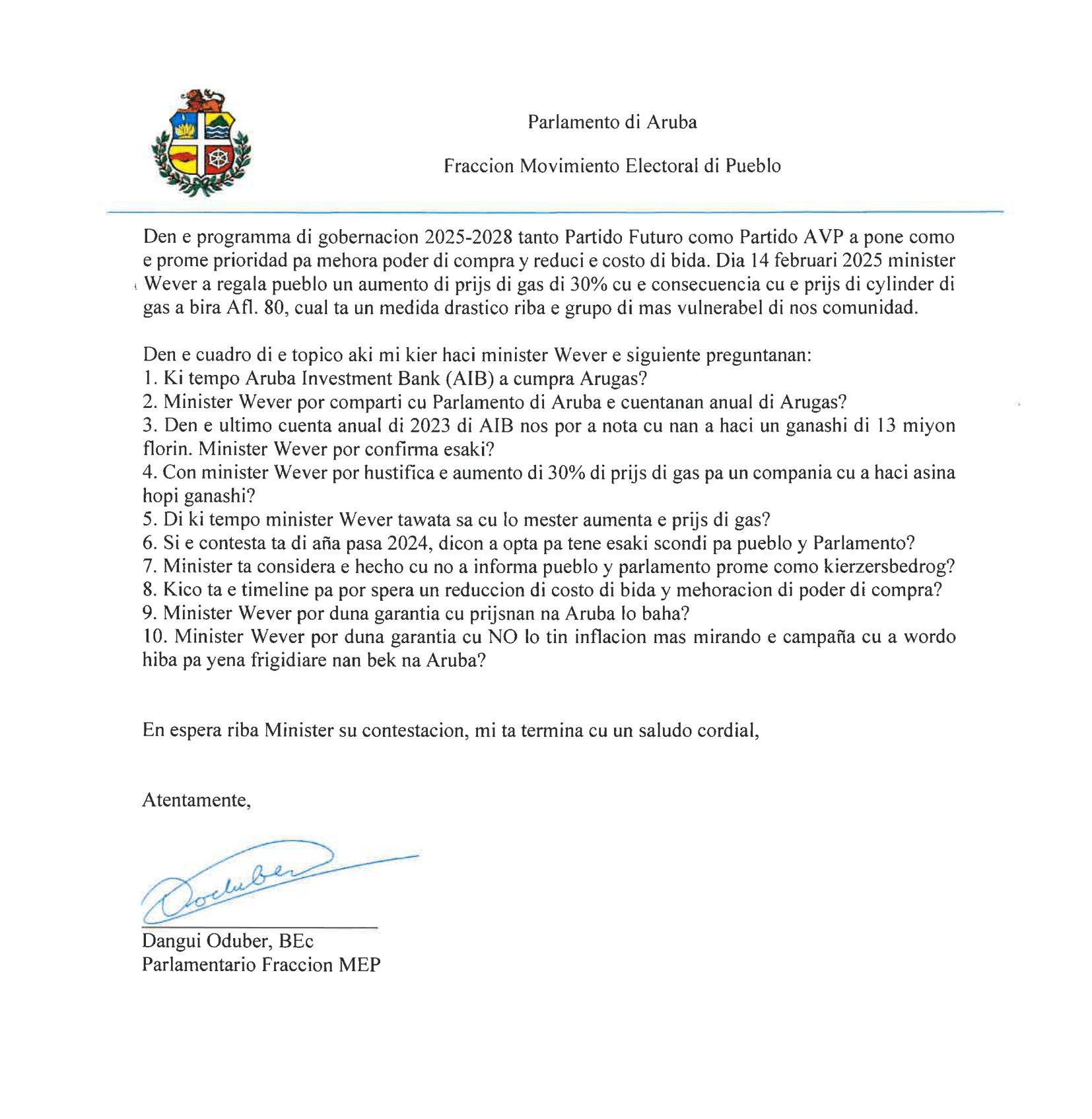 Mirando e impacto cu e decision aki tini, Parlamentario Oduber ta exigi un splicacion cla di e gobierno tocante e base y hustificacion pa un aumento asina drastico. “Nos ta spera cu e minister por duna un clarificacion detaya tocante e desicion di a subi e prijs di gas domestico, specialmente despues di a campaña di mehora e poder di compra di nos ciudadanonan.”