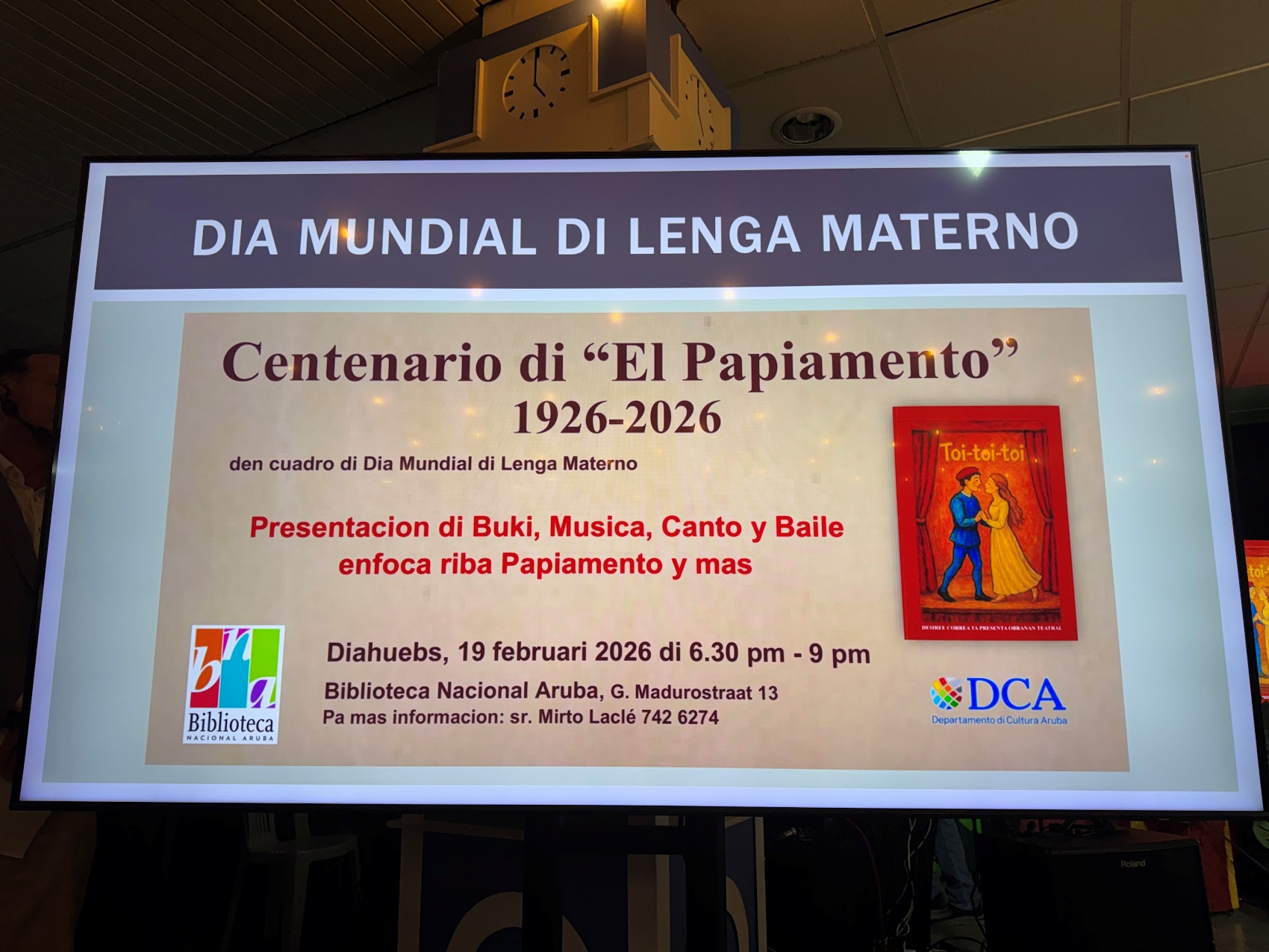 Pa e ocasion special aki Parlamentario Xiomara Maduro tabata presente na un charla di sr. Mirto Laclé na Biblioteca Nacional titula: “Ban causa furor cu Dia Mundial di Lenga Materno.” Un bunita evento na unda nos lenga materno Papiamento a wordo celebra den canto, poesia, musica y literatura.