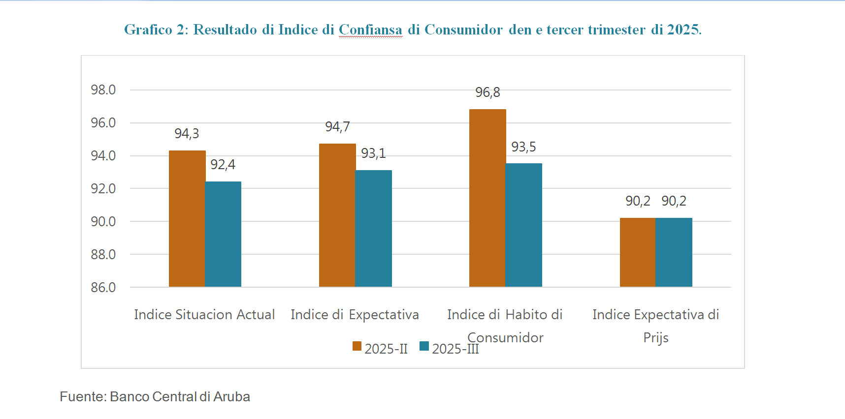 E Indice di Habito di Consumidor a baha cu 3,3 punto di indice te na 93,5 durante e tercer trimester di 2025. E Indice di Situacion Actual y e Indice di Expectativa a baha den e di tercer trimester di 2025 cu 1,9 punto di indice te na 92,4 y 1,6 punto di indice te na 93,1, respectivamente. Mientrastanto, e Indice di Expectativa di Prijs a keda igual na 90,2 durante e tercer trimester di 2025.