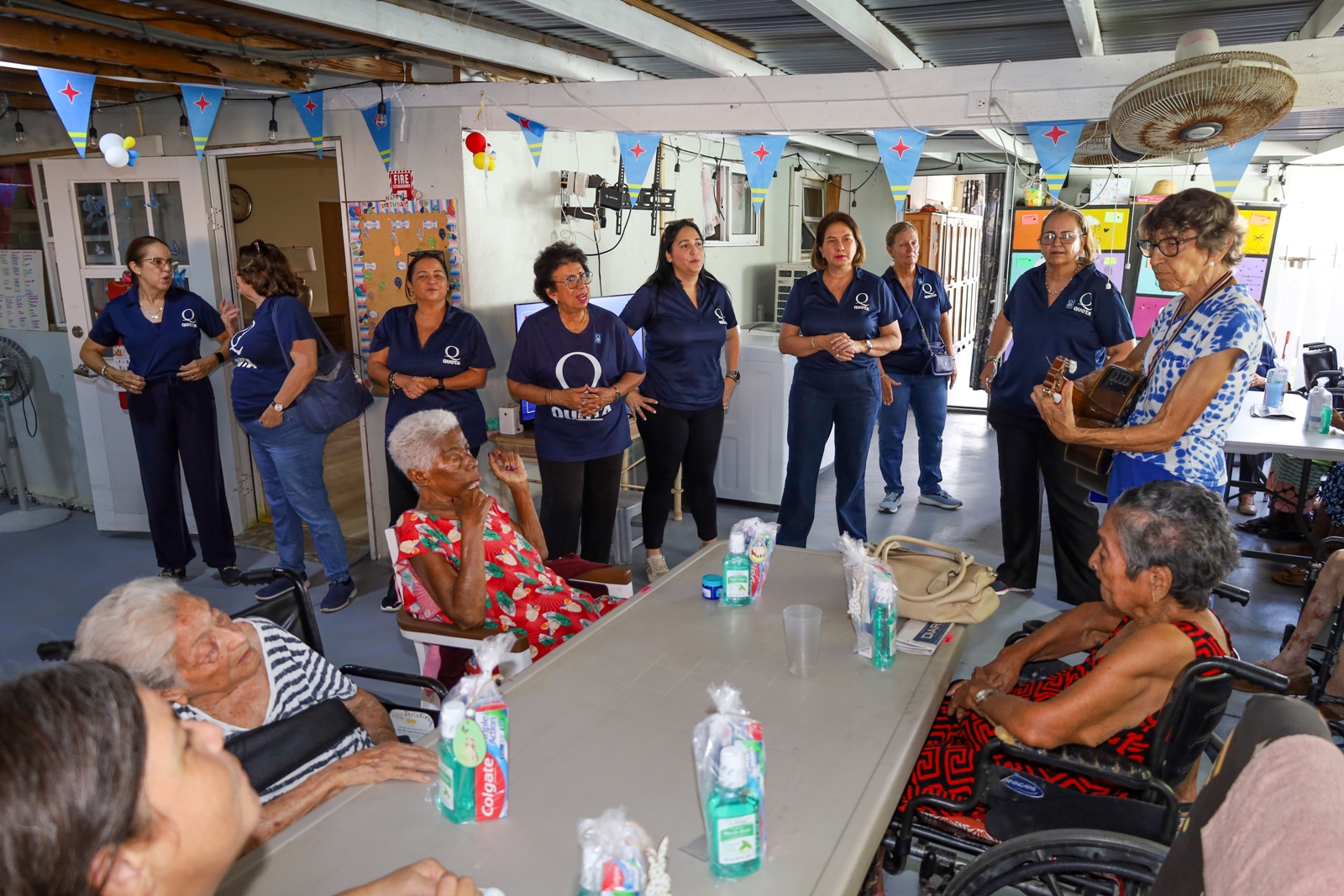 Durante e bishita, Quota Club of Aruba a entrega varios articulonan esencial pa contribui na bienestar di e residentenan. Entre e donacionnan tabata tin laken, serbete, tayo, bekers, productonan di higiena personal, weganan, kleurboek di mandala, regalonan pa Pasco Grandi, y aparatonan practico manera toaster y sandwich makers pa uzo diario.