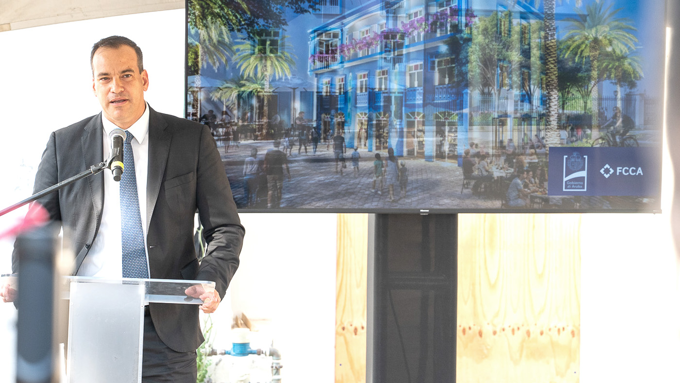 “Pa hopi aña e edificio aki tabata bashi y pa nos revitalisa e centro di Oranjestad Gobierno a dicidi riba mi peticion pa traspasa e edificio aki na FCCA bou di e condicion cu FCCA ta converti e edificio aki den un studentenflat di mas o menos 25 apartamento pa studiante y riba e promer piso un espacio pa un restaurant of bar. Mi ta sumamente contento cu FCCA a kere den e vision aki y cu e trabao di renobacion ta inicia awe. Una bes cu e studentenflat aki keda cla nos lo tin mas o menos 25 studiante ta biba den e centro di Oranjestad, cu lo duna un ambiente completamente nobo na nos centro di ciudad. Nos vision ta pa hende biba den Oranjestad y cu e proyecto aki nos ta demostra cu nos ta implementa nos vision”, segun Minister Geoffrey Wever.
