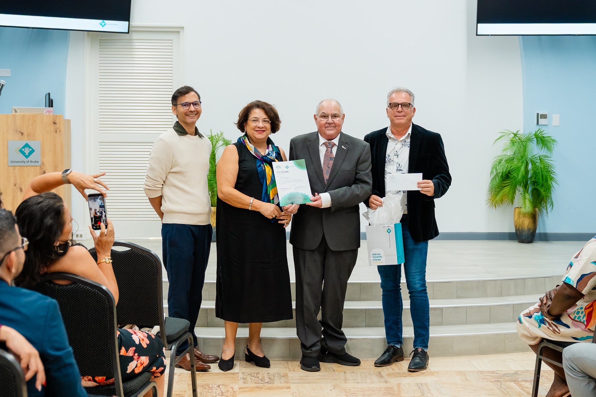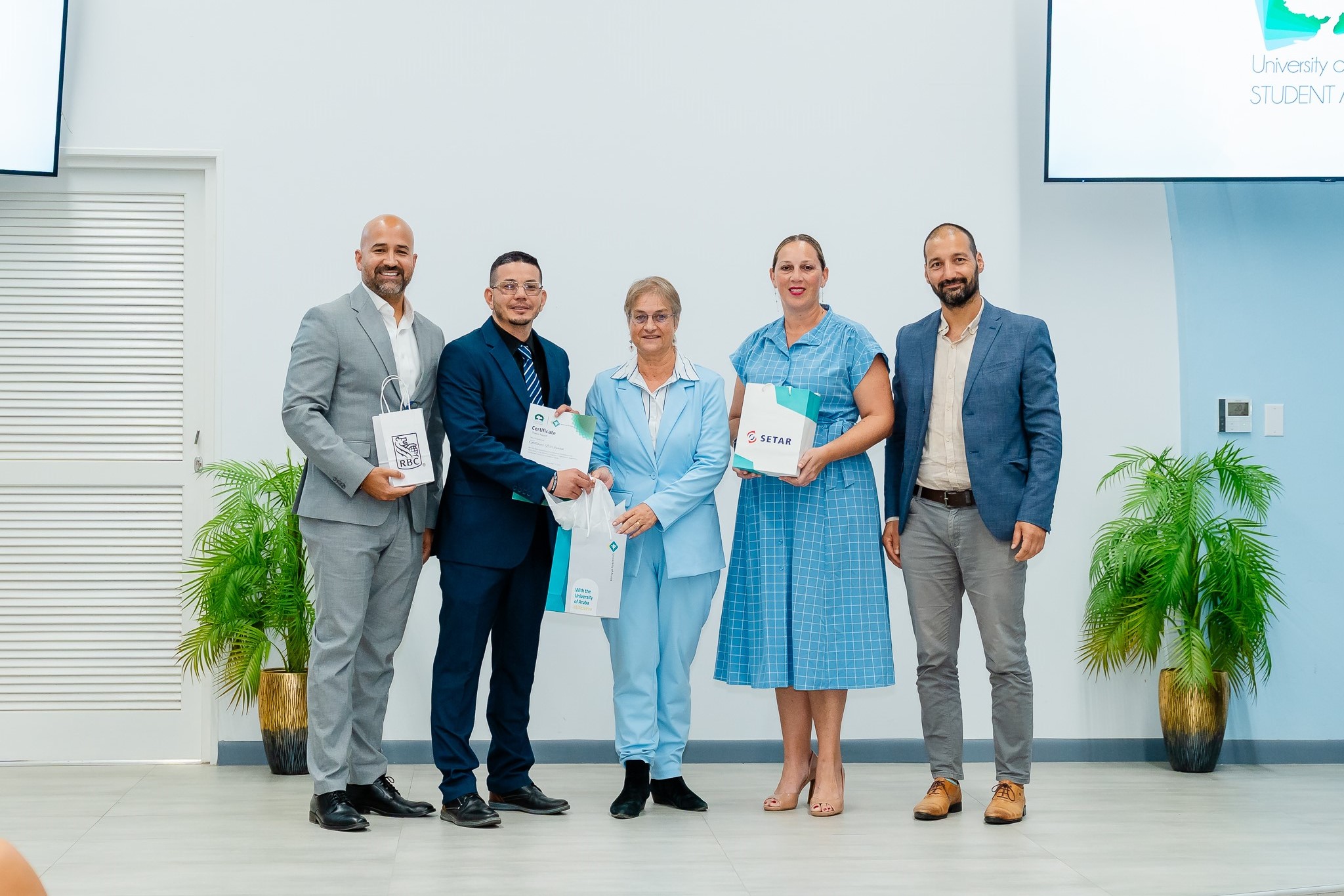 ORANJESTAD (AAN): E ceremonia anual di reconocemento na Universidad di Aruba (UA) a premia e studiantenan mas sobresaliente, poniendo luz riba nan excelente investigacionnan y nan conexion fuerte cu e comunidad local. E reconocimentonan presenta den un asociacion cu companianan prominente, ta mustra e calidad halto di trabao academico cu ta worde haci y e balor inmediato cu e ta trece pa negoshi di Aruba y e panaroma social.