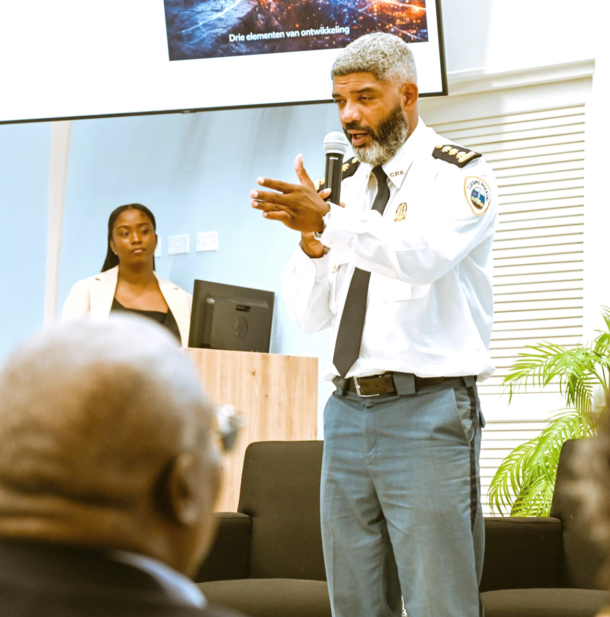 Den su presentacion, sr. Arnhem a duna un bista general di e desaroyonan mas relevante den e seno di Cuerpo Policial di Aruba desde 1986. El a resalta con e institucion a crece, modernisa y adapta su mes na e exigencianan di un sociedad den cambio, semper cu e meta pa garantisa seguridad y orden publico.