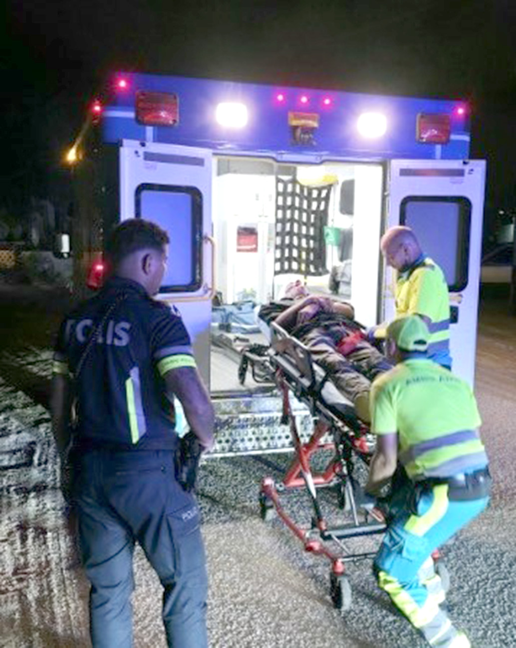 Ambulance tambe a yega, y mesora Paramediconan a cuminza analiza e victima, y a dicidi pa pone riba brancard por si acaso e tin weso kibra, y ta bay cu ne pa Servicio di Emergencia na Hospital.