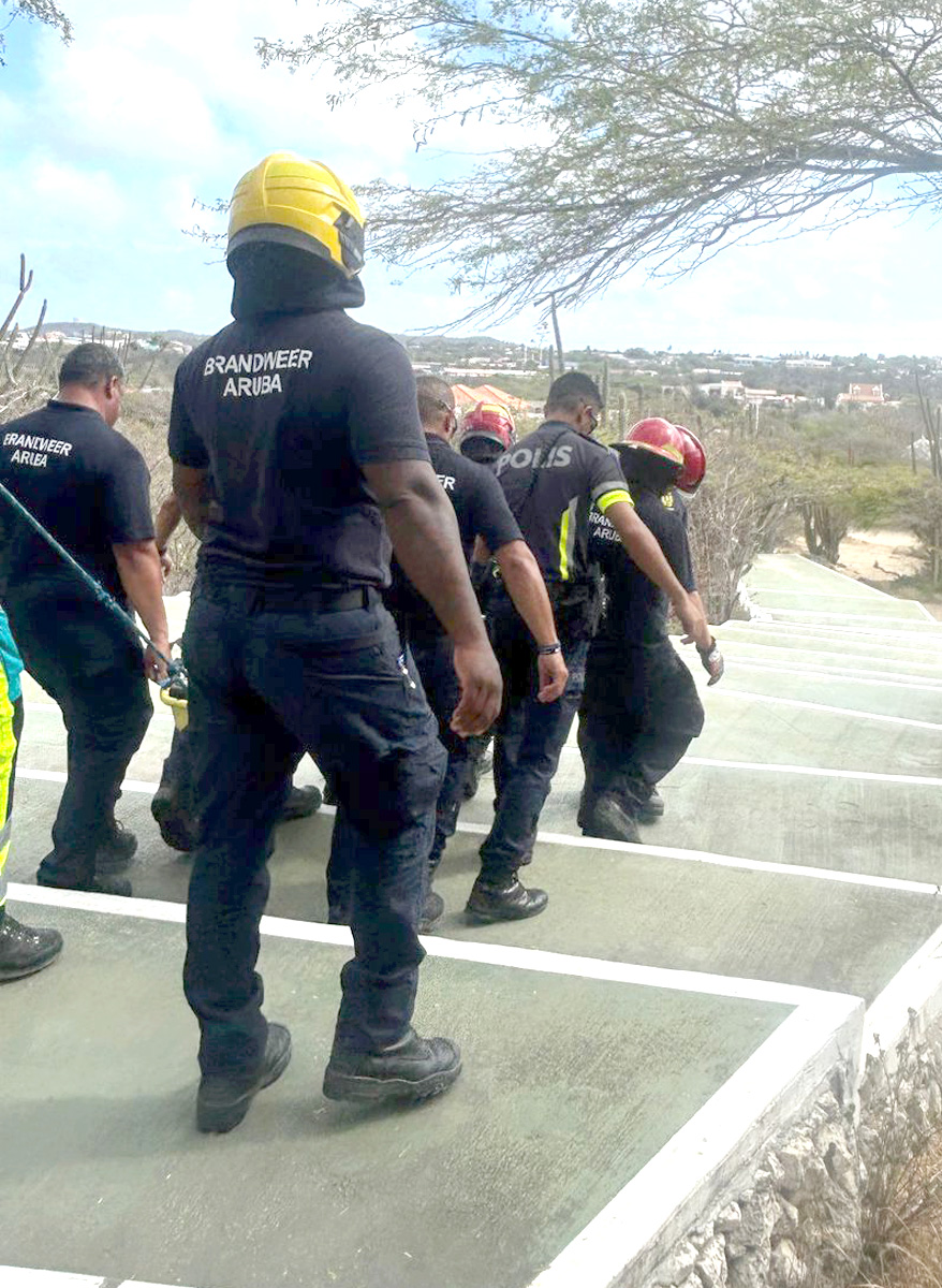 Aki ta unda cu instancianan a uni forza pa haci un bon trabao di rescate. Den un forma tactico y bon coordina, hunto cu Team di Rescate forma pa Bombero y Ambulance, Polis a subi e top di Hooiberg pa atende e turista cu a bira malo. Riba e top di sero, primeramente ta personal di Ambulance a stabilisa e turista masculino pa asina prepar’e pa bah’e for di e sero.