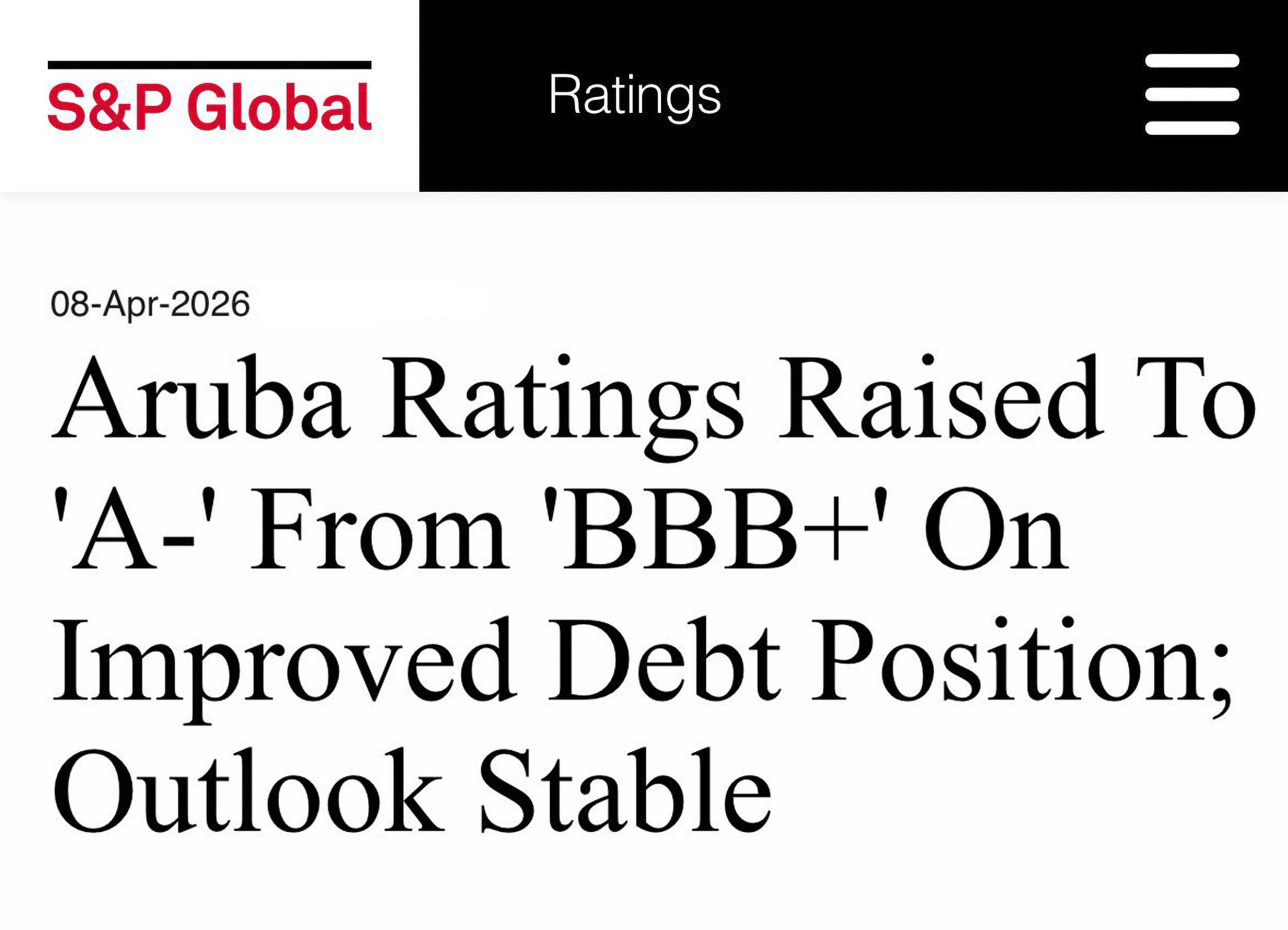 Rating upgrade di S&P na A- pa Aruba ta confirma