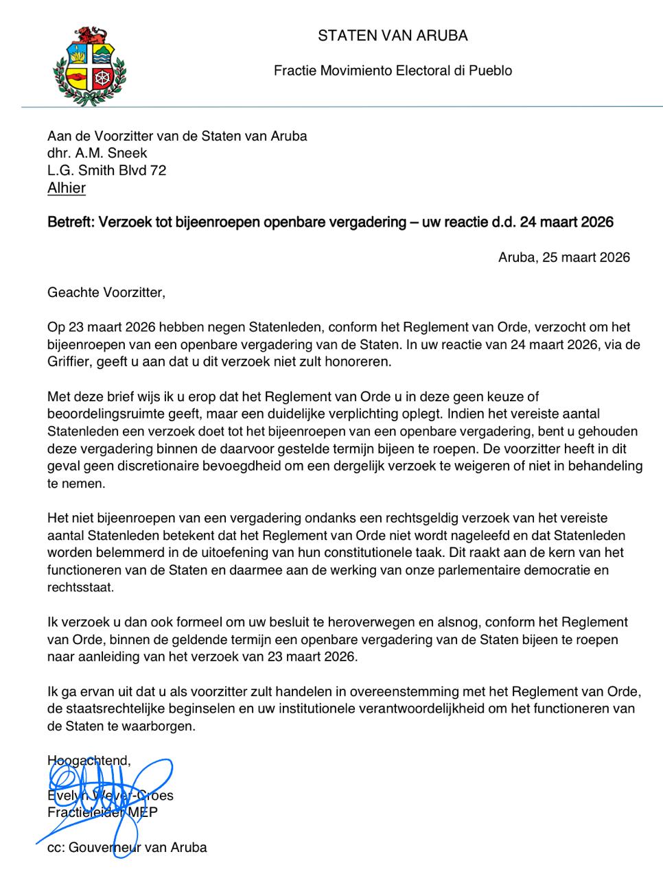 Wever-Croes a manda un carta pa sr. Marlon Sneek, den cual el a haci un yamada serio na e Presidente di Parlamento pa e cumpli cu su deber, respeta e Reglamento di Orden, y yama e reunion dentro di 30 dia, manera mester ta segun ley. No pa un partido, no pa un gobierno, no pa un oposicion, pero pa Aruba y pa nos democracia.