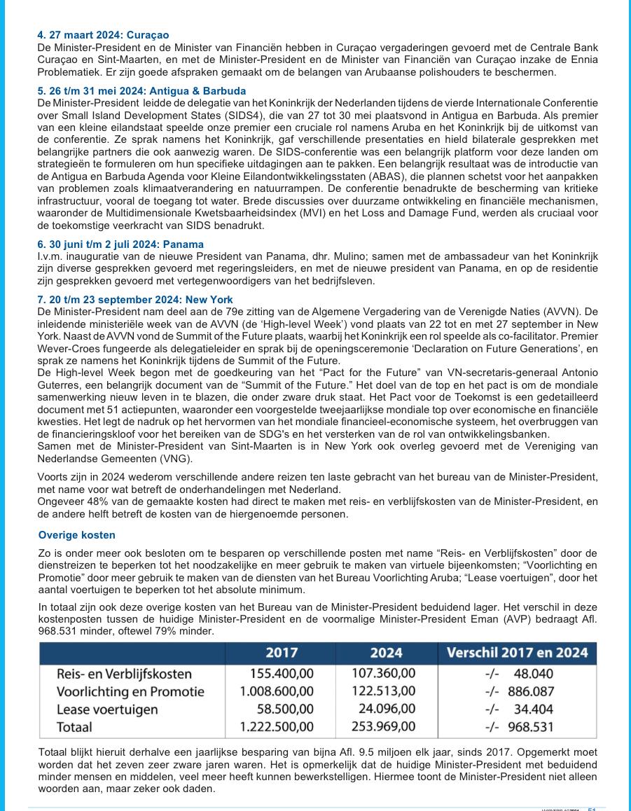 E diferencia den nivel di gobernacion ta keda demostra ora compara esaki cu e standardnan di MEP. Den e informe anual (jaarverslag) di e oficina di Prome Minister, tur biahe ta wordo registra cu transparencia total: specificando e meta, e resultado pa nos pais y e gastonan exacto te na e ultimo florin.