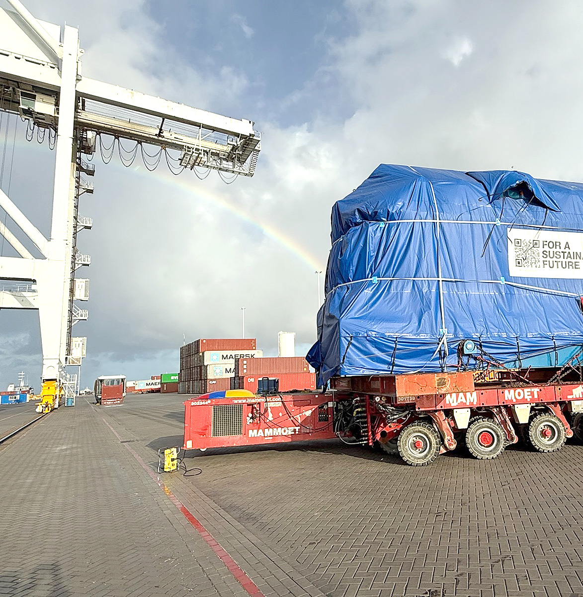 E motor gigantesco aki tin un peso di alrededor di 300.000 kg (300 ton). Cada set motor/generator ta produci awor un capacidad di 18 MegaWatt (MW), cual ta 7 MW mas cu motornan actual di planta RECIP3. Dialuna ya for di 4’or di marduga caba tabatin personal encarga cu e transporte presente na Waf. El a wordo baha for di e barco di carga, y poni riba un trailer special cu monton di wiel y cu por sostene e peso. Un poco prome cu 8:40 am, e transporte a start saliendo for di Barcadera.