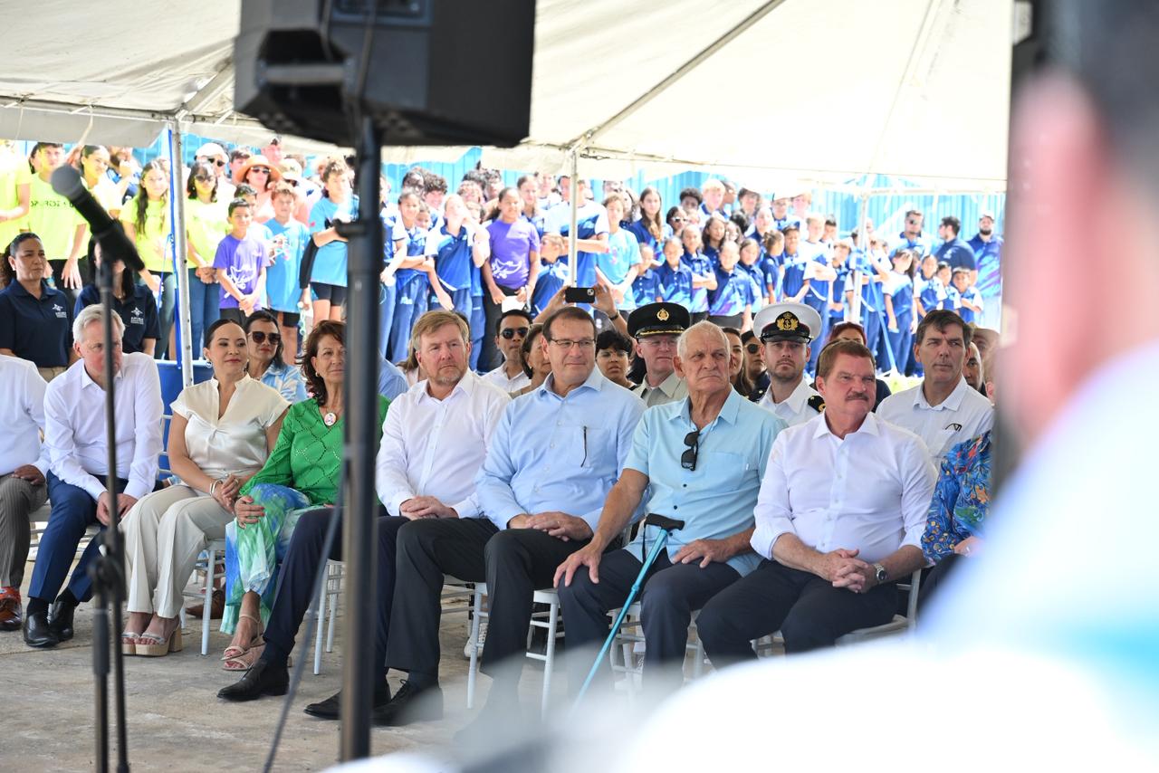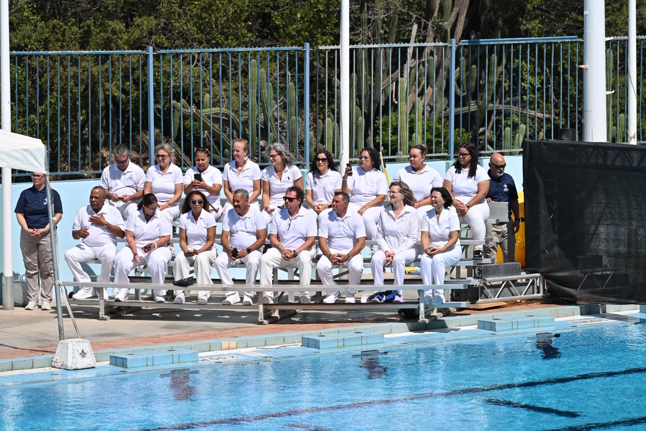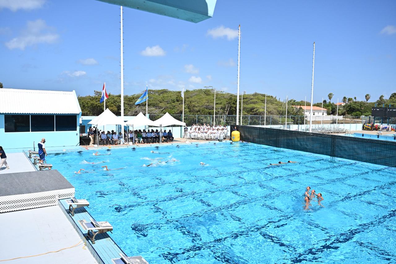Durante e yegada di e Rey, representante di e federacionnan di natacion y deportistanan di Aruba a duna un caluroso bonbini. Minister di Deporte, sra. mr. Gerlien Croes a ser acompaña pa e presidente di Aruba Aquatics Federation, Edrick Winterdal, cu a dirigi palabra di ricibimento, despues di cual e Rey a tuma asiento pa observa demostracion di diferente disciplina di natacion presenta door di atleta local.