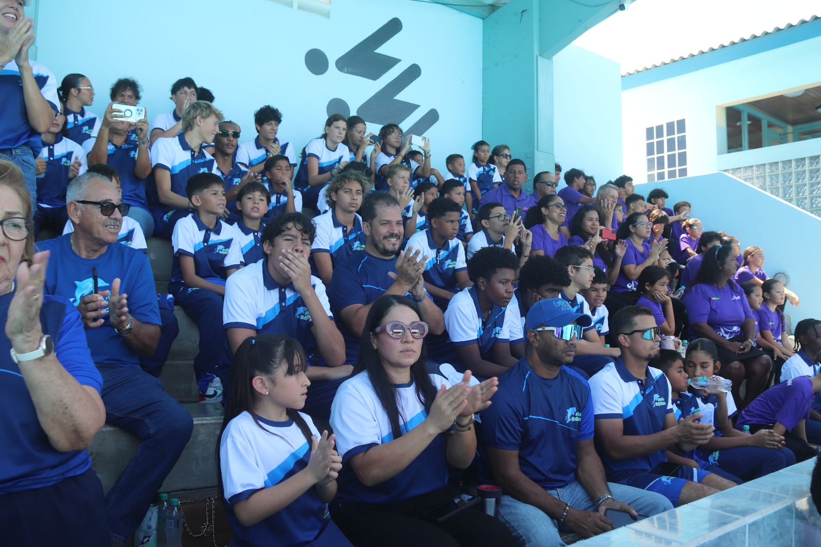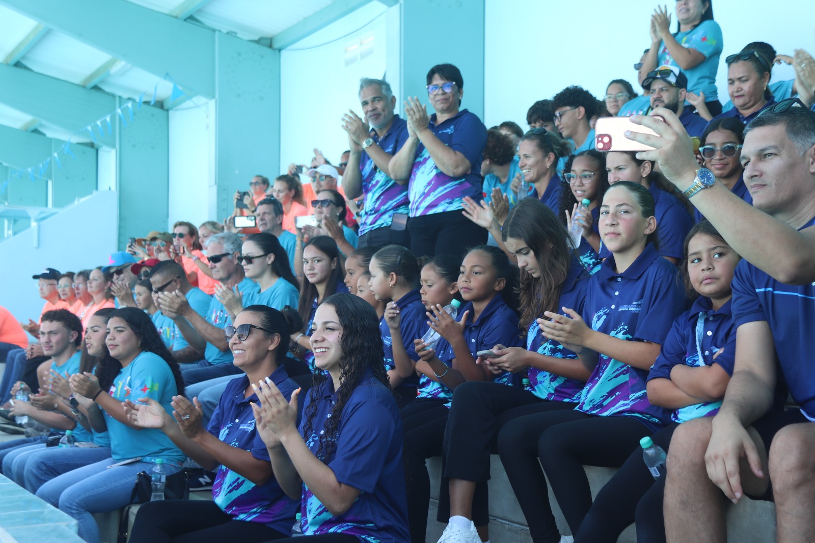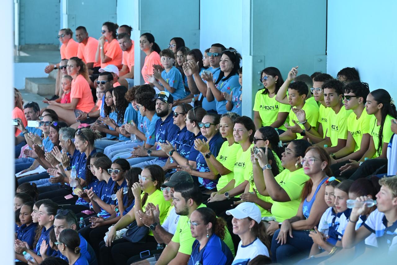 Durante e yegada di e Rey, representante di e federacionnan di natacion y deportistanan di Aruba a duna un caluroso bonbini. Minister di Deporte, sra. mr. Gerlien Croes a ser acompaña pa e presidente di Aruba Aquatics Federation, Edrick Winterdal, cu a dirigi palabra di ricibimento, despues di cual e Rey a tuma asiento pa observa demostracion di diferente disciplina di natacion presenta door di atleta local.