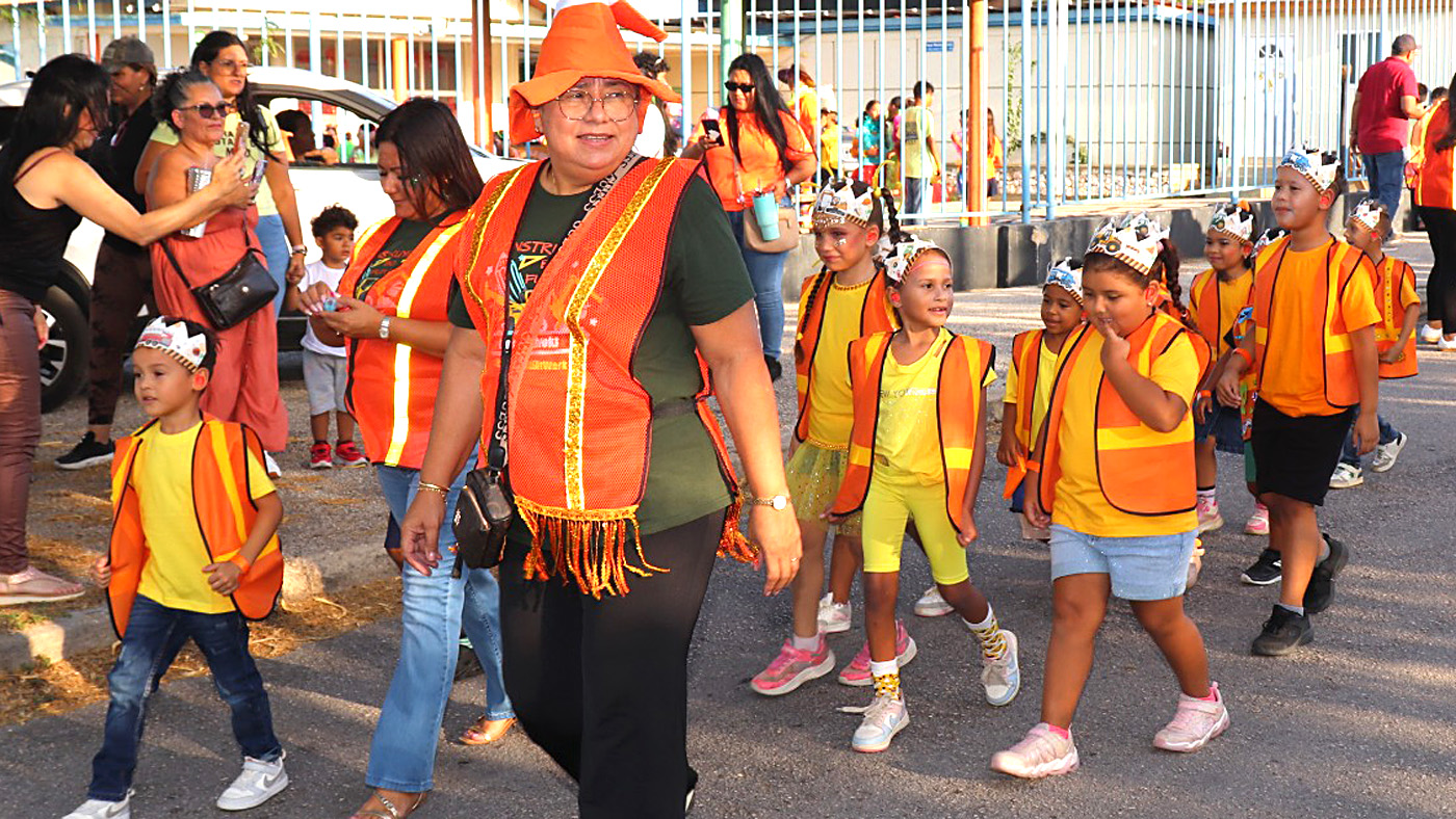 Maria Goretti College cu Ayo Kleuterschool a participa cu e tema di Construyendo Futuro, y e muchanan a bin cu nan trahe di trahador cu nan safety vest bisti, y tabata cana rond cu nan hardhat riba cabez ta jump sin stop.